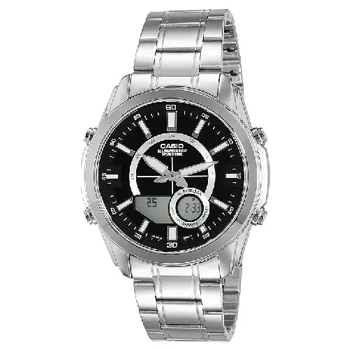 Experience classic style and smart functionality with the Casio Analog-Digital World Time Telememo AMW-810D-1AVDF Men's Watch. This sophisticated timepiece features a black analog-digital dial within a durable stainless steel case, complemented by a sleek stainless steel. With practical features like Telememo 30, World Time, 50-meter water resistance, and an amazing 10-year battery life, the AMW-810D-1AVDF is perfect for daily wear, travel, and staying organized, making it an ideal choice for the modern man.