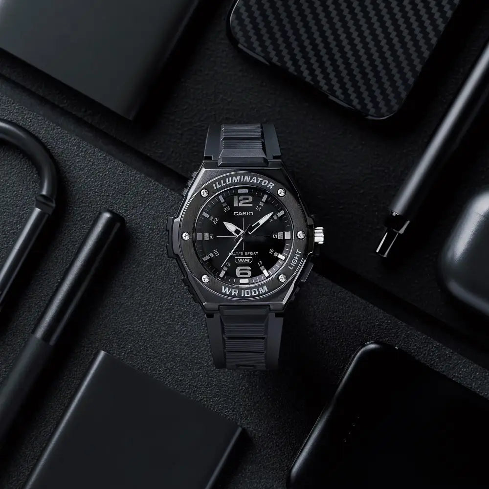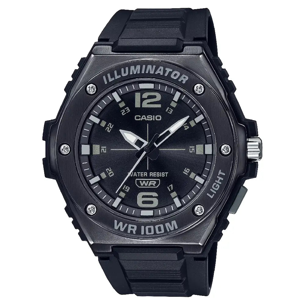 The Casio Analog MWA-100HB-1AVDF is a straightforward and durable analog watch with a rugged, sporty design. Its standout features include a clear, easy-to-read black dial with bold hour markers and hands, and a bright LED light for low-light visibility. The watch is powered by a reliable quartz movement and boasts a long-lasting battery life of approximately 3 years. With 100-meter water resistance, it is suitable for swimming and water sports. The watch's tough black resin case is paired with a durable and comfortable resin strap, ensuring a secure and adjustable fit for daily wear and outdoor adventures.