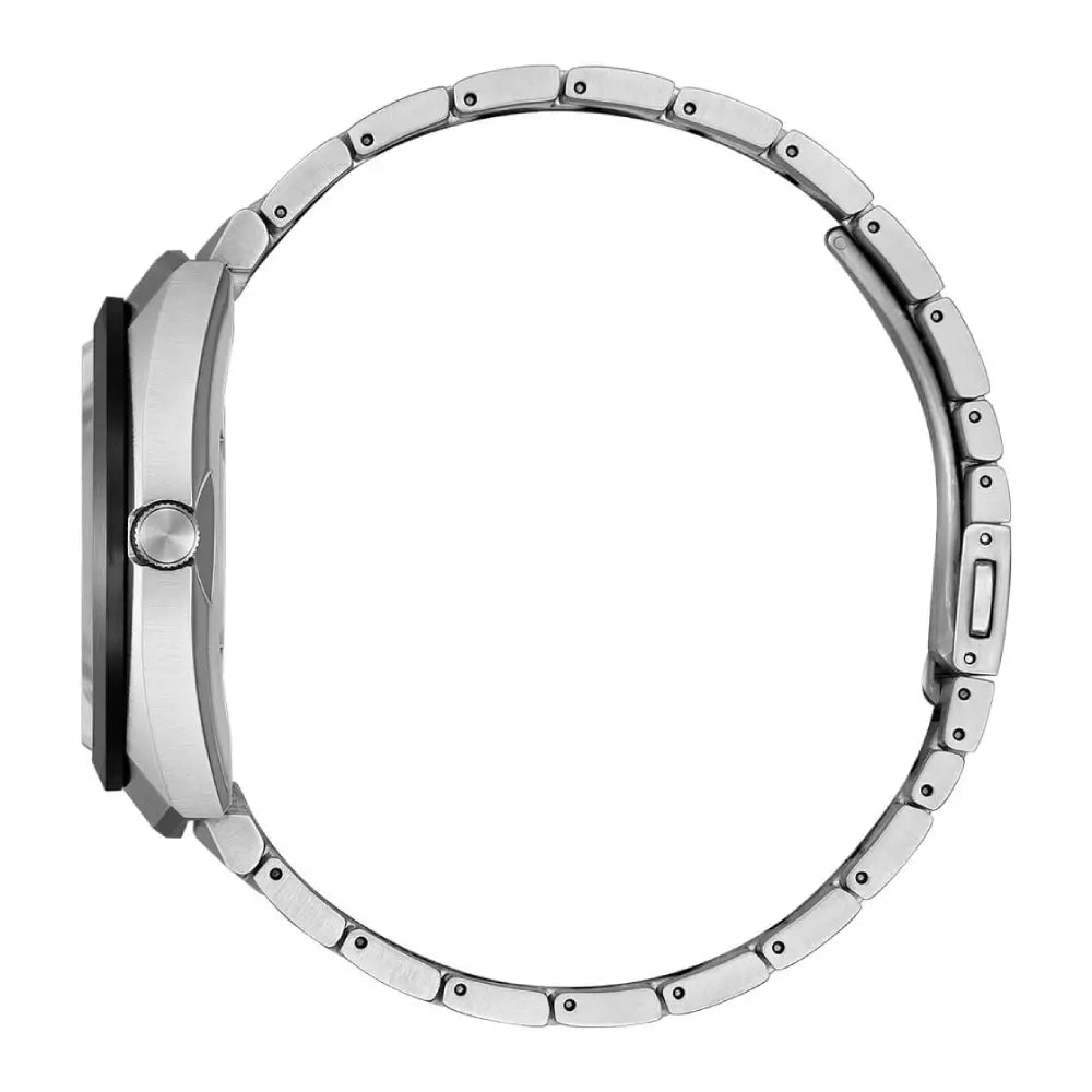 The CITIZEN Eco-Drive 365 model BN1014-55E showcases a classic design with a contemporary edge, featuring distinctive silver tones of stainless steel. The stainless steel case is defined by clean straight lines and flat surfaces, with distinctive ridgelines at 12 and 6 o'clock echoing the iconic CITIZEN Quartz EFA model from 1973 that harmonize with the bracelet's lines. It boasts a sparkling dial inspired by an endless starry sky and the beauty of our planet, achieved through advanced manufacturing techniques and a combination of four types of glittering accents. The metal indices are strategically placed on the outer ring to enhance the dial's depth. Its name, Eco-Drive 365, is derived from the cutting-edge technology that powers the watch, providing a remarkable power reserve that keeps the watch running for an entire year on a full charge, embodying the spirit of sustainability. This model is protected by sapphire glass with an anti-reflective coating, has a case diameter of 42.5mm, and offers a remarkable one-year power reserve with the Cal.E365 movement. It's water-resistant up to 10 BAR, blending durability with the legacy of CITIZEN's 1973 design inspiration.