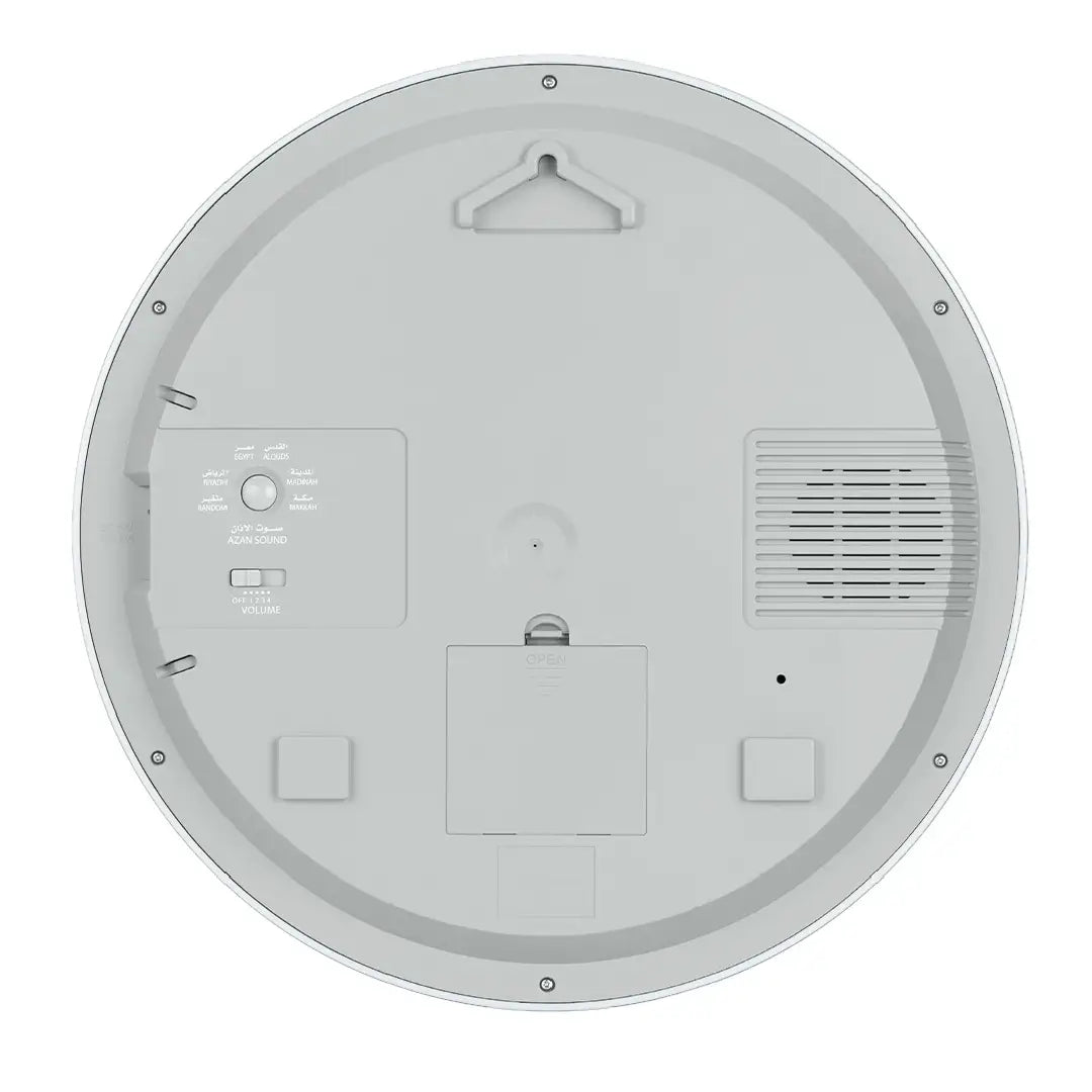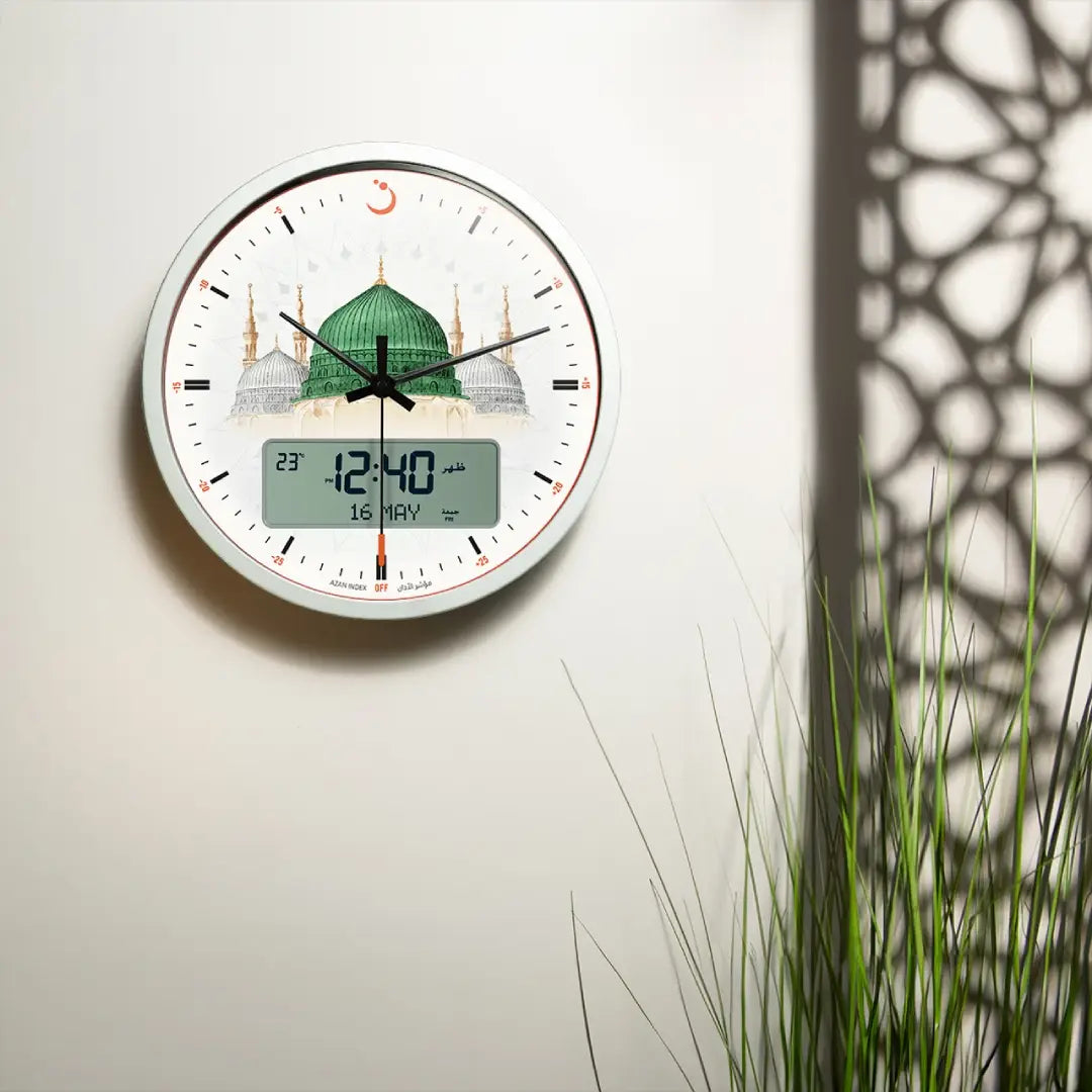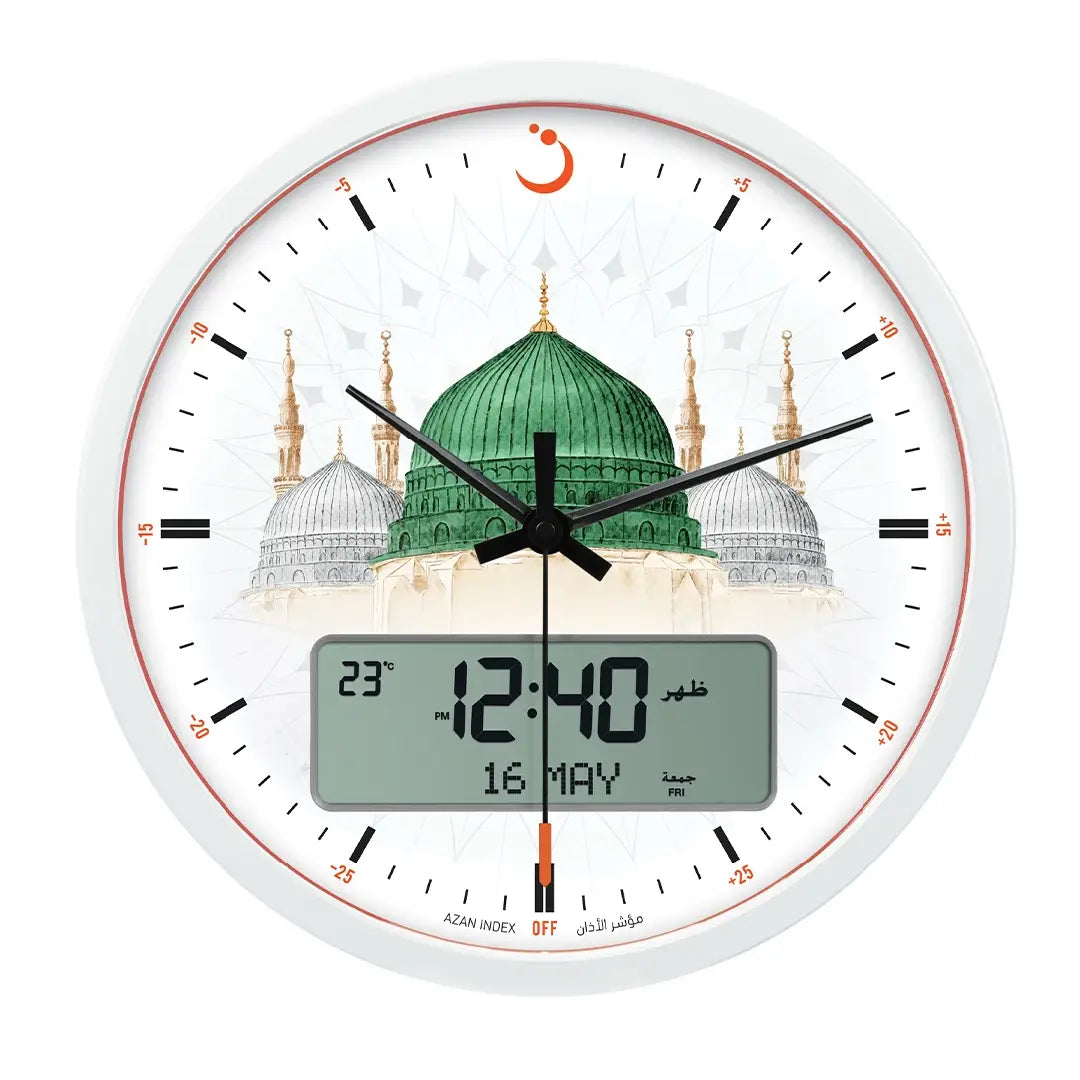 Adorn your space with spiritual elegance and timeless design using the Al Fajr CR-23M Analog-Digital Azan Wall Clock. This beautifully crafted round clock seamlessly blends classic analog hands with a clear digital LCD display, providing accurate worldwide prayer times with a choice of five distinct Azan sounds (including Makkah, Madinah, etc.). Beyond its precise Azan functionalities, it also shows Hijri and Gregorian calendars, Qibla direction, and temperature. Easy to mount and visually appealing, the CR-23M is a perfect addition to any home, mosque, or office, offering both aesthetic charm and essential spiritual guidance.