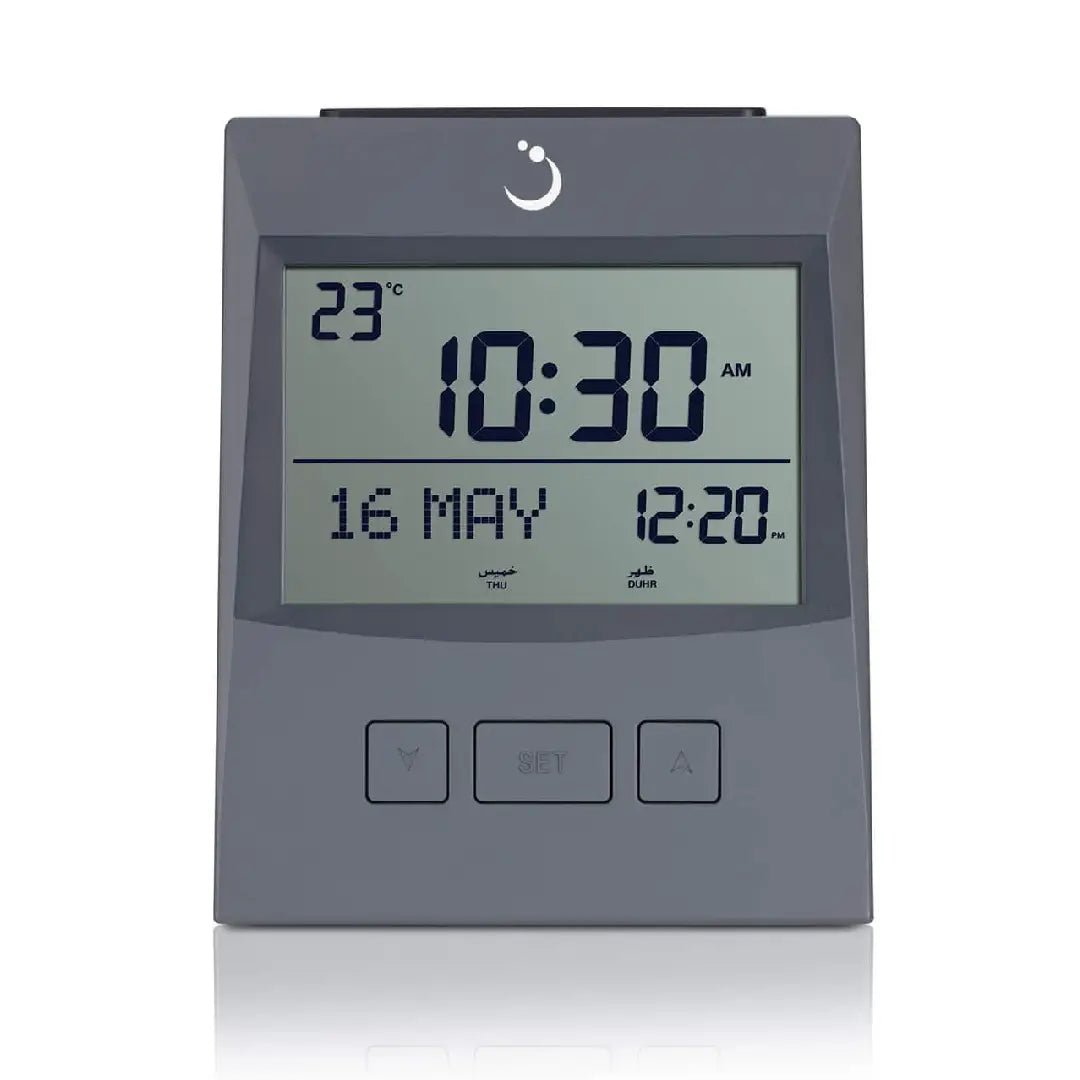 Stay connected to your faith wherever you go with the Al Fajr CS-13 Digital Azan Table Clock. This compact and versatile clock is perfect for your desk, bedside table, or for travel, offering accurate worldwide prayer times and alarms with a convenient full-screen light. Its clear digital display also shows Hijri and Gregorian calendars, Qibla direction, and temperature. With its user-friendly interface and portable design, the CS-13 is an indispensable tool for maintaining your spiritual routine, combining essential Islamic functionalities with modern convenience.