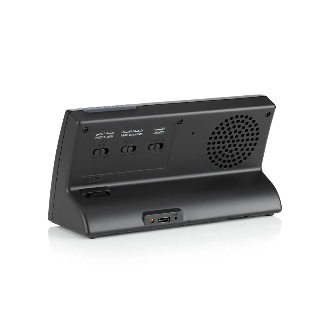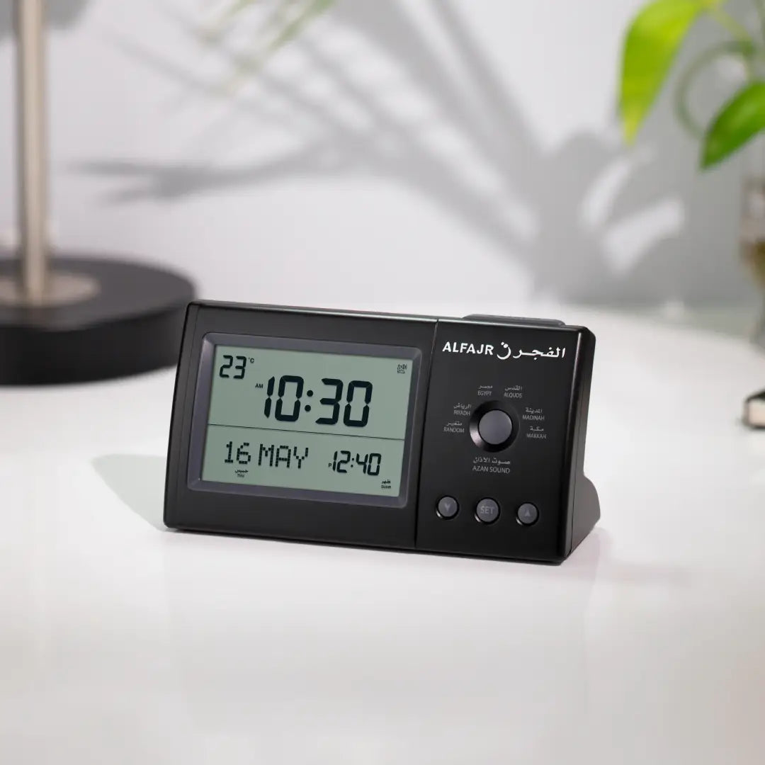 Enhance your living or workspace with the elegant Al Fajr CT-11 Digital Azan Table Clock. This compact and stylish clock provides accurate worldwide prayer times with a choice of five beautiful Azan sounds, ensuring timely reminders for devotion. Its clear, wide-viewing angle digital LCD features full-screen illumination for easy readability in any light. The CT-11 also displays Qibla direction, temperature, and both Hijri and Gregorian calendars. With its user-friendly interface and sleek design, it's the perfect blend of modern aesthetics and essential Islamic functionality for any bedside table, desk, or shelf.