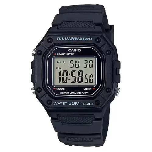 The Casio W-218H-1AVDF is a durable and practical digital watch, known for its classic square-face design and affordability. This model includes a stopwatch, a daily alarm, an hourly time signal, and an LED backlight for easy reading in the dark. It is 50-meter water resistant, making it suitable for swimming and everyday use. The watch is powered by a long-lasting battery, offering years of use without replacement. Its durable black resin case and comfortable black resin strap make it an excellent choice for a no-fuss, everyday timepiece, often considered a modern update to the classic F-91W.