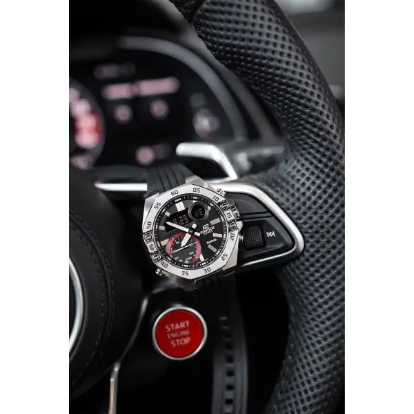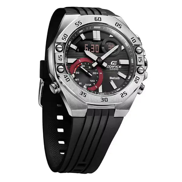Connect to precision with the Casio Edifice Bluetooth Analog-Digital ECB-10P-1A Men's Watch. This high-performance timepiece features Bluetooth Smartphone Link, offering seamless auto time adjustment, schedule management, and world time for over 300 cities. Its rugged black resin strap complements a bold design with an octagonal bezel, evoking professional motorsports. Equipped with a 1/1000-second stopwatch, Super Illuminator LED light, and 100M water resistance, the ECB-10P-1A is built for speed and intelligence, making it an indispensable tool for the modern, connected man.