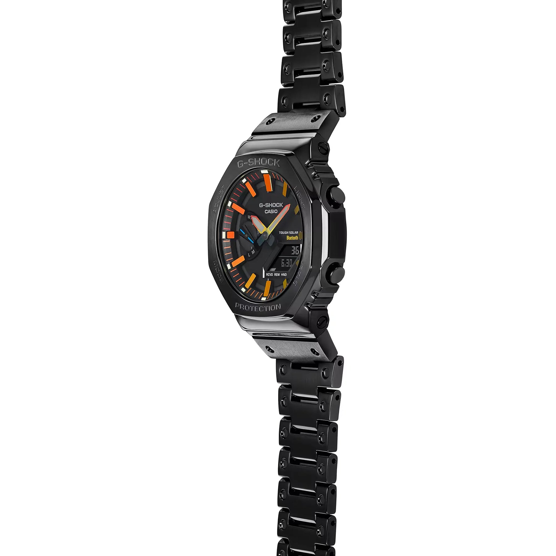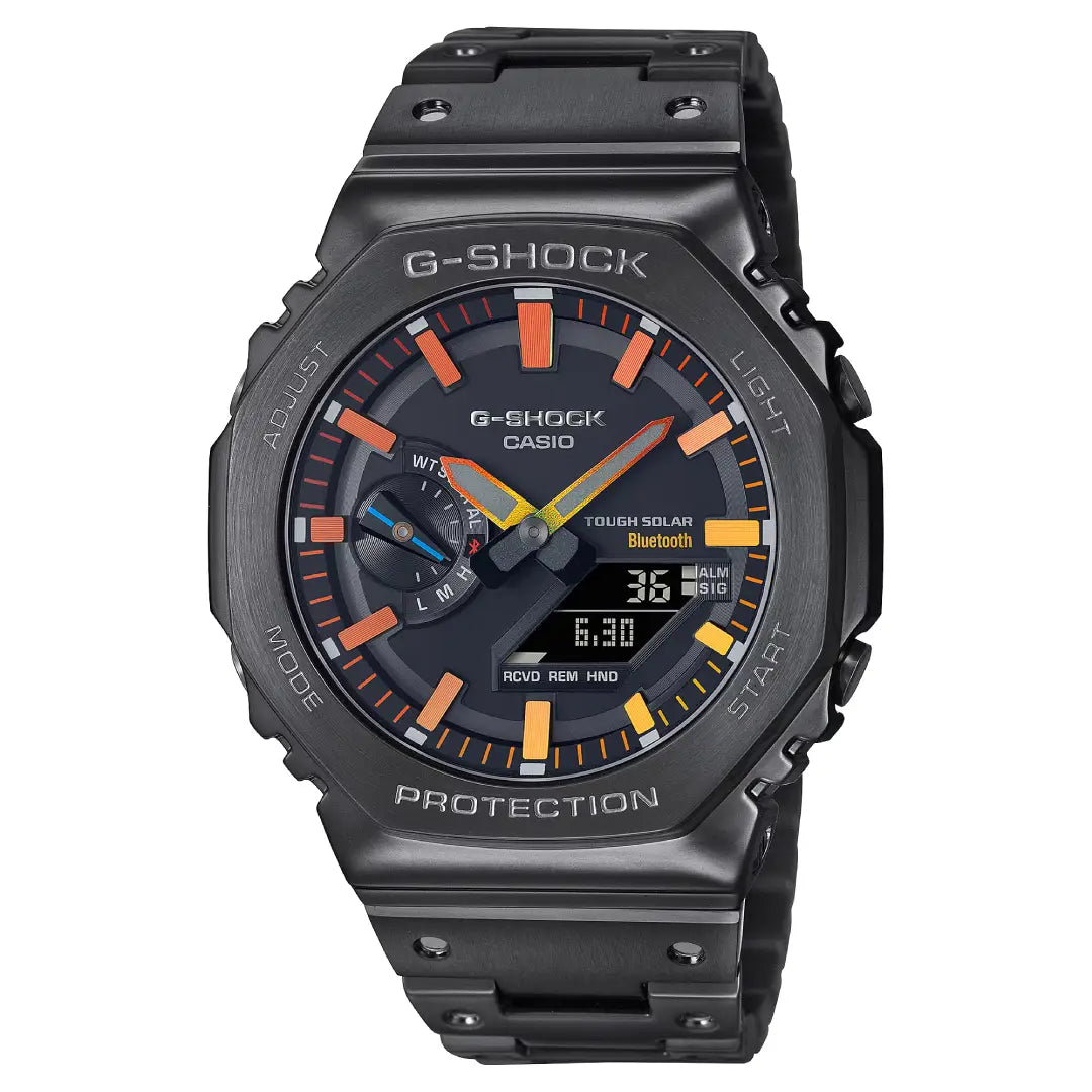 Elevate your style with the G-Shock GM-B2100BPC-1ADR, a premium Full Metal iteration of the iconic CasiOak octagonal design. This robust men's watch features a sophisticated black ion-plated stainless steel case and bracelet, offering exceptional durability and a sleek aesthetic. Its black dial is beautifully enhanced by orange and yellow color gradation on the hour markers and hands, creating a unique and expressive visual. Powered by Tough Solar for light-powered operation and equipped with Bluetooth?Smartphone Link, it ensures precise, automatic time adjustment and easy control of features like world time (38 time zones), 1/100-second chronograph, 5 daily alarms, and a full auto-calendar. With G-Shock's legendary shock resistance, a mineral glass, and 200-meter water resistance, this timepiece masterfully blends cutting-edge technology, luxurious materials, and a distinctive design for the discerning wearer.