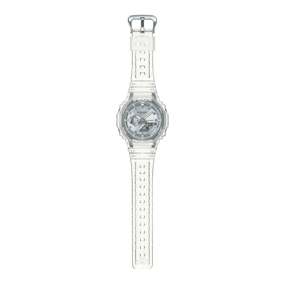 The Casio G-Shock GA-2100BM-7A8DR is a sleek and durable timepiece that combines modern aesthetics with G-Shock's renowned toughness. Featuring a silver metallic dial set within a translucent resin case and strap, this watch offers a contemporary look. Built with a carbon core guard structure and 200-meter water resistance, it's designed to withstand rigorous activities while maintaining a fashionable appearance.