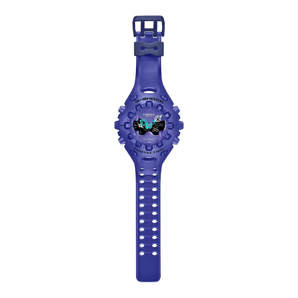 Experience a fusion of classic G-SHOCK toughness and a futuristic aesthetic with the Casio G Shock Analog-Digital GA-V01-2ADR men's watch. This robust timepiece, part of the "Virtual V01" series, features a captivating purple dial with an iridescent vapor-inspired finish that shifts and changes with the light. The watch is housed within a durable 48.6mm x 45.9mm semi-transparent purple case. As a true G-SHOCK, this watch offers exceptional shock resistance and a water resistance of 200 meters. The analog-digital display provides clear timekeeping, while a full suite of functions including world time, a stopwatch, a countdown timer, and multiple alarms ensures you're ready for any adventure. The semi-transparent purple resin strap perfectly complements the watch's unique and futuristic design, making the Casio G Shock GA-V01-2ADR a perfect choice for those who demand both rugged performance and a standout style.