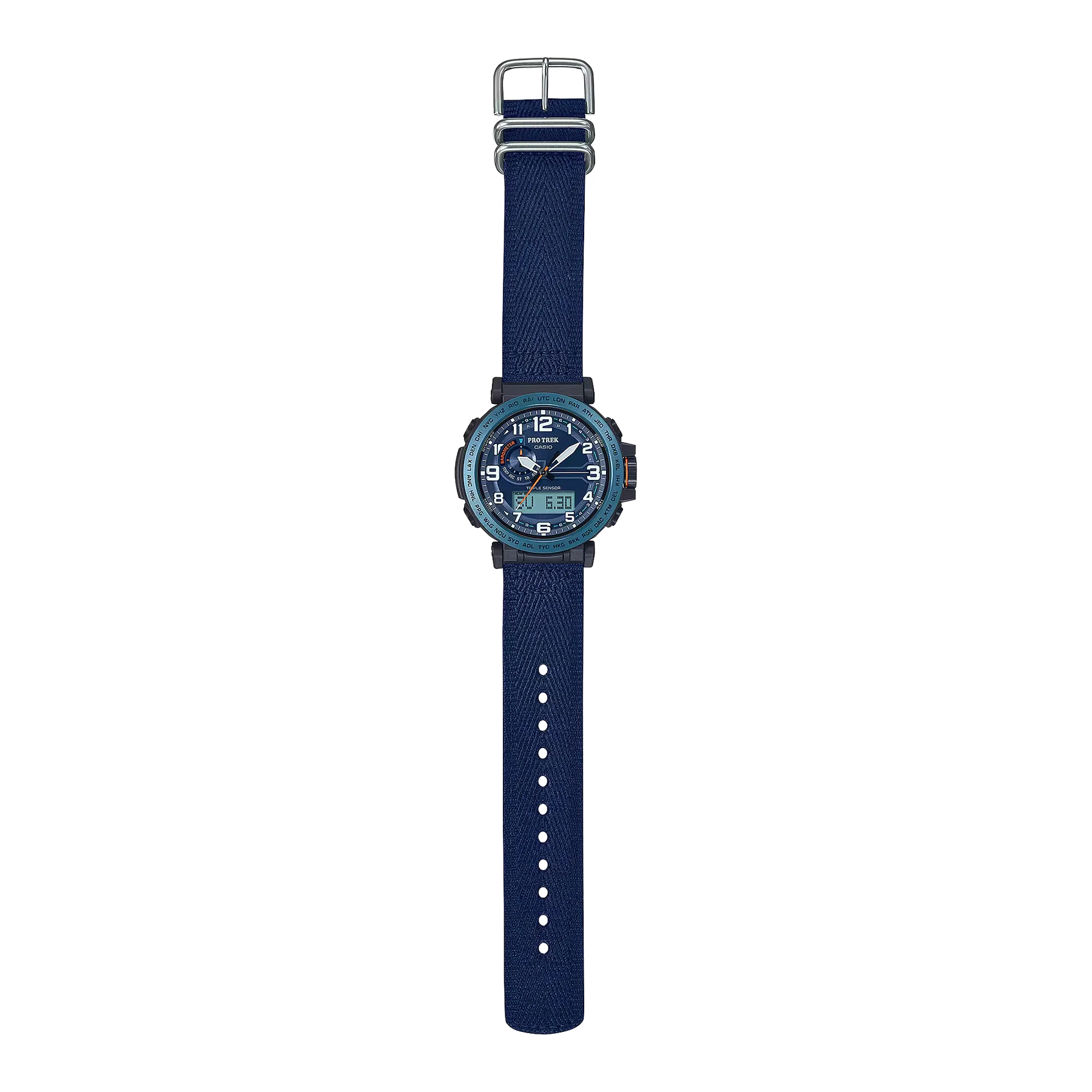 Embrace the spirit of adventure with the Casio Pro Trek PRG-601YB-2DR, a timepiece designed for outdoor enthusiasts and eco-conscious explorers. This analog-digital watch combines advanced Triple Sensor technology?digital compass, barometer/altimeter, and thermometer?with Tough Solar power, ensuring reliability in the most challenging environments. Crafted with sustainability in mind, it features a bio-based resin case and a durable cloth band made from recycled plastic bottles. The bold blue dial, accented with orange highlights, offers both style and readability, making it an ideal companion for both wilderness adventures and urban explorations.