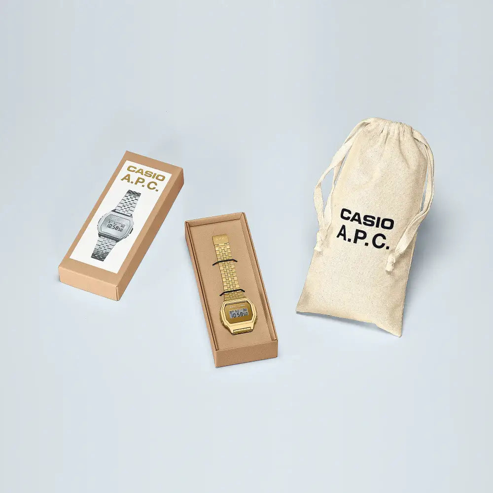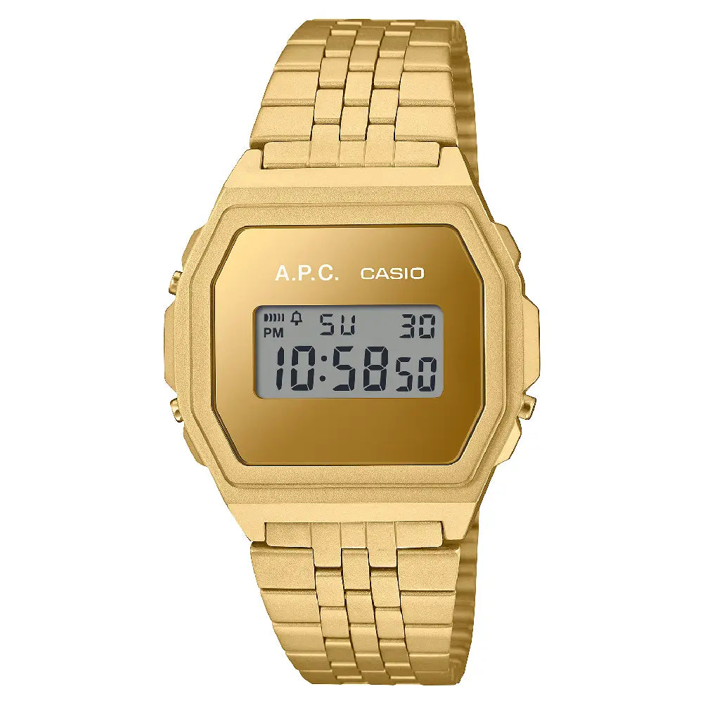 Experience a fusion of vintage aesthetics and modern design with the Casio Vintage A.P.C. Collaboration Digital A1000ACG-9DR unisex watch. This iconic timepiece features a sleek, gold-toned dial with a mirror-like finish and a clear digital display, all housed within a compact 39.6mm octagonal stainless steel case. Powered by a precise quartz movement, this watch provides reliable timekeeping along with a full suite of digital functions, including a stopwatch, daily alarm, and LED backlight. The watch is protected by a durable mineral glass and is complemented by a matching gold-toned stainless steel bracelet with an easily adjustable clasp. The Casio A1000ACG-9DR is a perfect accessory for those who appreciate a minimalist yet retro style with the dependability of a modern timepiece.