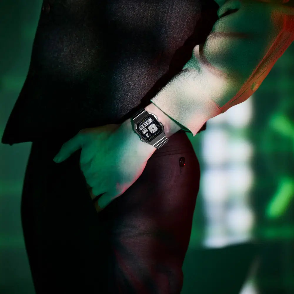 Step back in time with a touch of modern flair with the Casio Vintage Digital A130WE-1ADF Unisex Watch. This retro timepiece revives a classic 1980s design, featuring a unique layout with four prominent front buttons that offer intuitive control. Its sleek stainless steel band complements a chrome-plated resin case, housing a clear black digital dial. Practical functions include an amber LED backlight for easy reading, a stopwatch, daily alarm, and auto-calendar. Water-resistant and built for daily wear, the A130WE-1ADF is a perfect blend of nostalgic aesthetics, distinctive design, and reliable Casio functionality, making it a standout accessory for any vintage enthusiast.