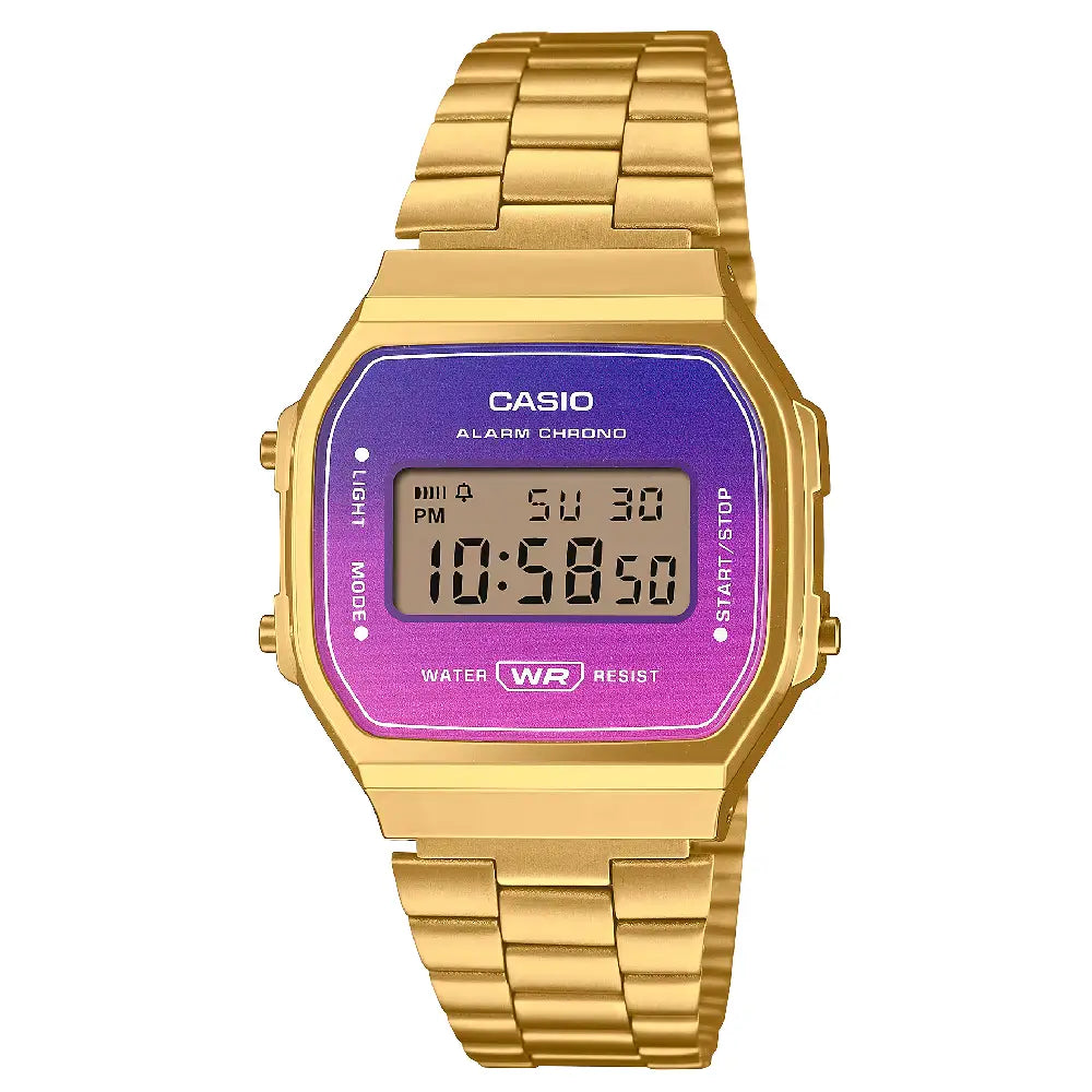Add a vibrant, fashion-forward statement to your wrist with the Casio Vintage Digital A168WERG-2ADF Unisex Watch. This iconic timepiece features a beloved retro design, distinguished by its sleek gold ion-plated stainless steel and a truly unique digital dial that transitions beautifully between blue and purple hues. Its clear display offers essential functions including a 1/100-second stopwatch, daily alarm, and an auto-calendar, all brilliantly illuminated by its signature Electro-luminescent backlight. Water-resistant and celebrated for its timeless appeal and exceptional durability, the A168WERG-2ADF is a versatile and essential accessory that effortlessly blends vintage aesthetics with modern performance and a captivating pop of color for any wrist.