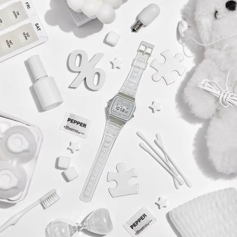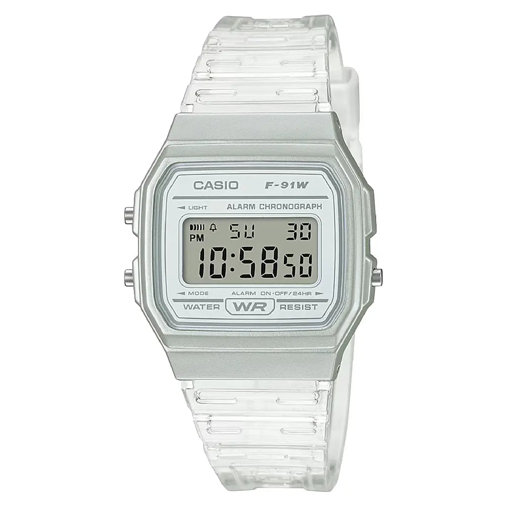 The Casio F-91WS-7DF is an iconic and timeless digital watch, celebrated for its simple design, durability, and reliability. It is part of the Casio Vintage collection and features a unique semi-transparent white resin case and a comfortable, semi-transparent white resin strap. The watch has a classic white dial with a green LED backlight for easy reading in the dark. Powered by a reliable quartz movement, it boasts an impressive 7-year battery life and is water-resistant, making it suitable for everyday wear. Key functions include a 1/100-second stopwatch, a daily alarm, and an auto-calendar.