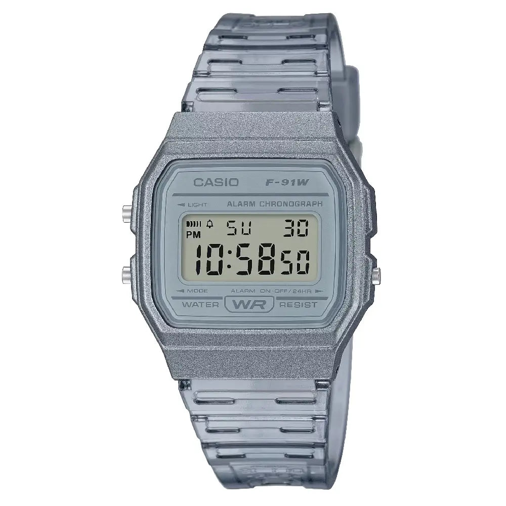 The Casio F-91WS-8 is an iconic and timeless digital watch, celebrated for its simple design, durability, and reliability. It is part of the Casio Vintage collection and features a unique semi-transparent grey resin case and a comfortable, semi-transparent grey resin strap. The watch has a classic Gray dial with a green LED backlight for easy reading in the dark. Powered by a reliable quartz movement, it boasts an impressive 7-year battery life and is water-resistant, making it suitable for everyday wear. Key functions include a 1/100-second stopwatch, a daily alarm, and an auto-calendar.