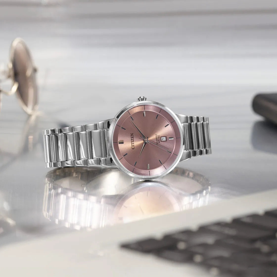 Make a stylish statement with the Citizen Quartz Analog 40mm BI5120-51Z Men's Watch. This unique timepiece features a sophisticated pink dial with a date function, all framed by a durable 40mm stainless steel case. Powered by a precise quartz movement, it offers reliable timekeeping and is water-resistant up to 50 meters. The stylish stainless steel bracelet provides a polished and secure fit, making this watch an excellent choice for those who appreciate a timepiece that is both functional and fashion-forward.