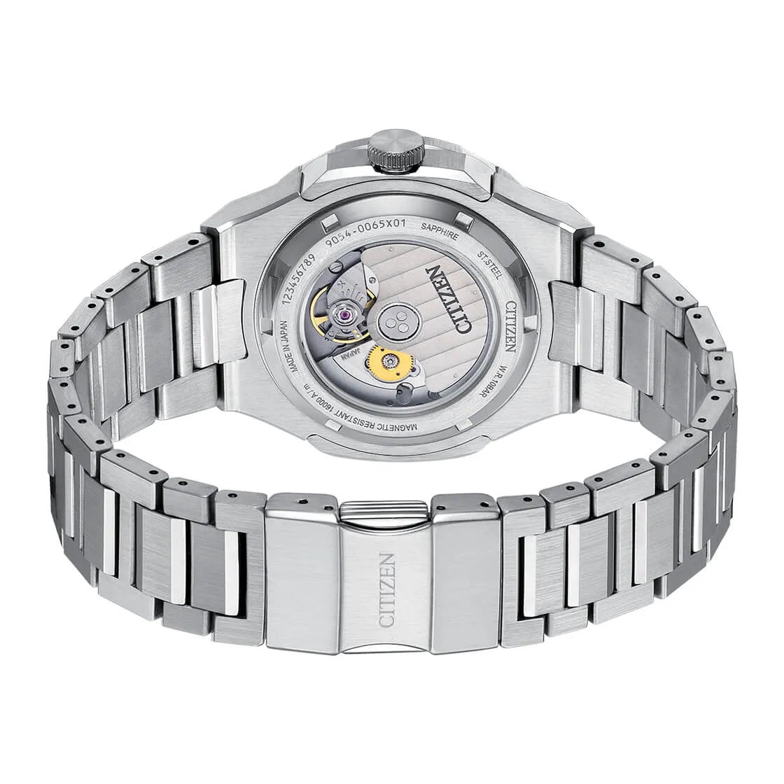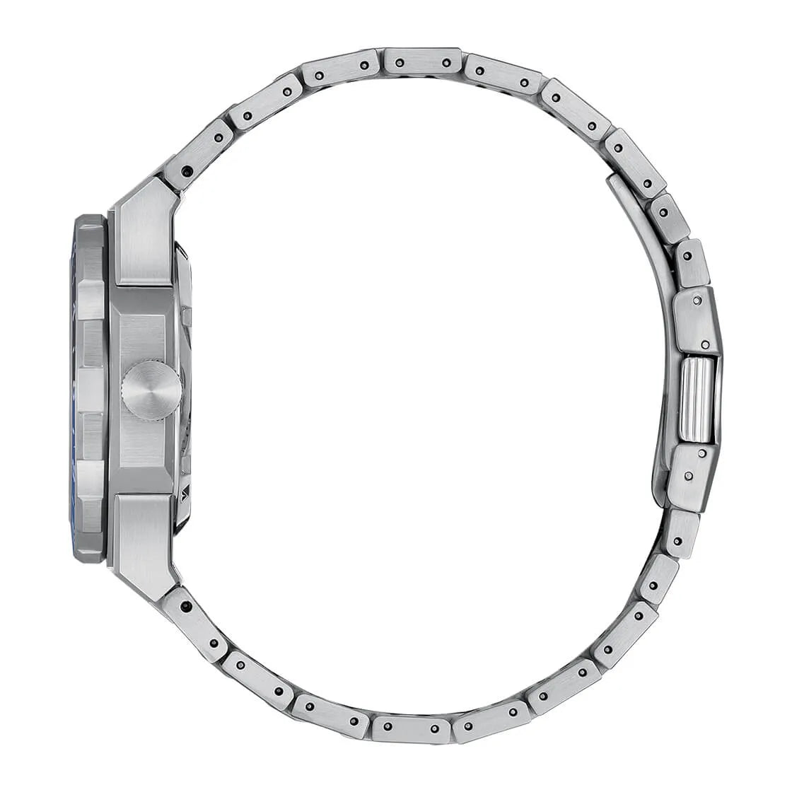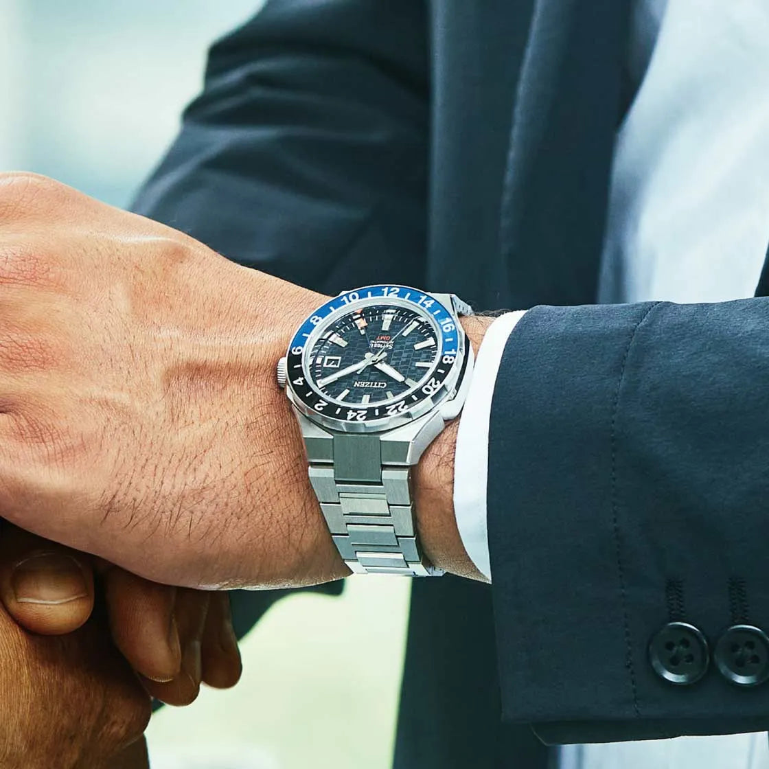Experience the perfect blend of modern design and advanced functionality with the Citizen Series 8 GMT NB6031-56E. This men's automatic watch features a striking black dial with a textured pattern inspired by Tokyo's skyline, housed in a robust stainless steel case. Equipped with Citizen's in-house Caliber 9054 movement, it offers true GMT functionality, allowing independent adjustment of the local hour hand—a feature prized by frequent travelers. The black and blue bi-directional bezel adds a sporty touch, while the integrated stainless steel bracelet ensures a seamless fit. With a 50-hour power reserve and magnetic resistance up to 16,000 A/m, this timepiece is both reliable and stylish, making it an ideal companion for global adventures.