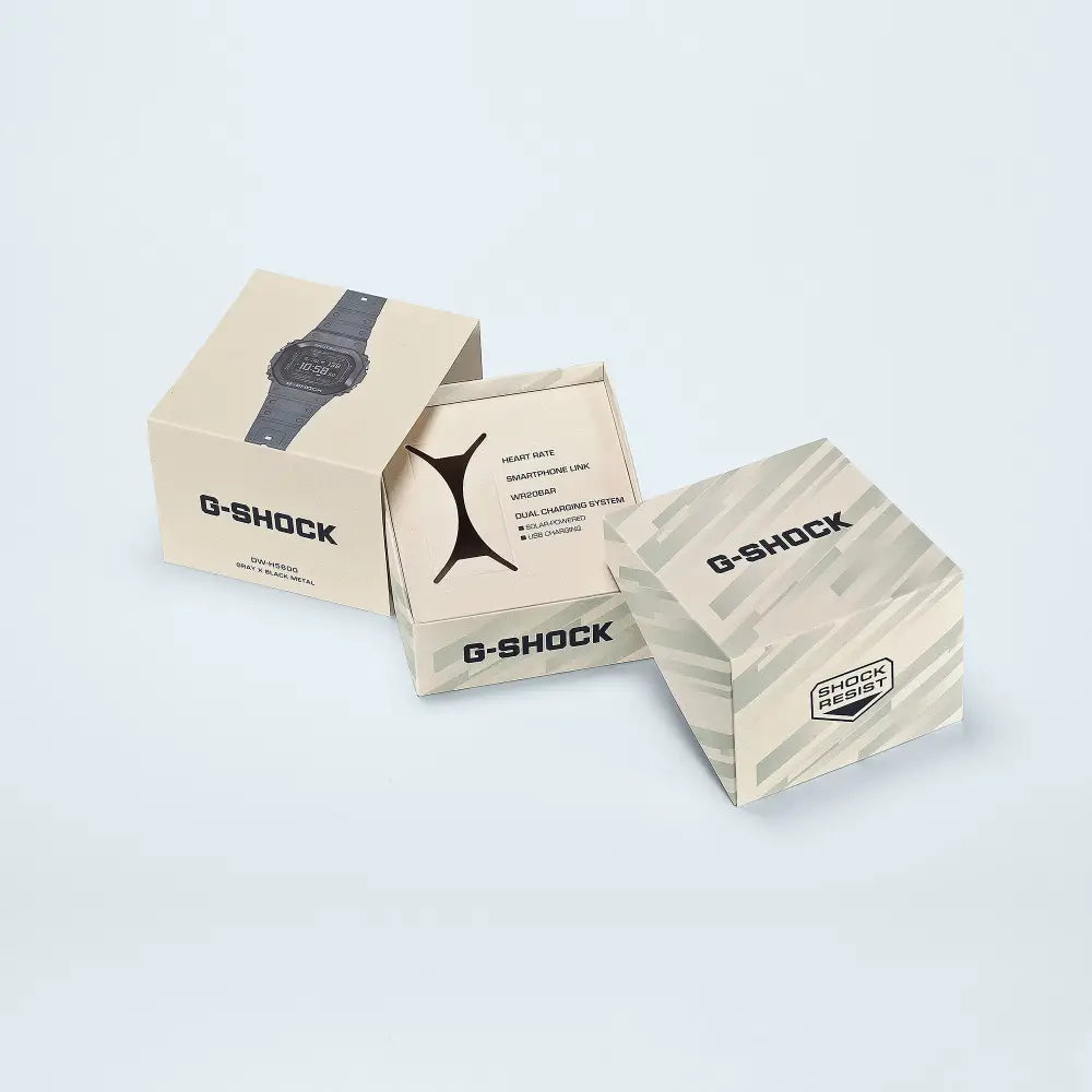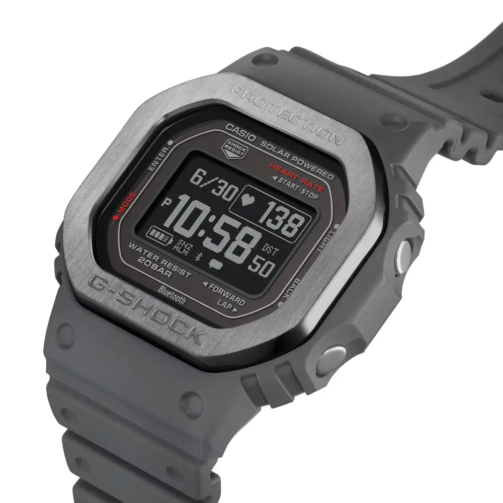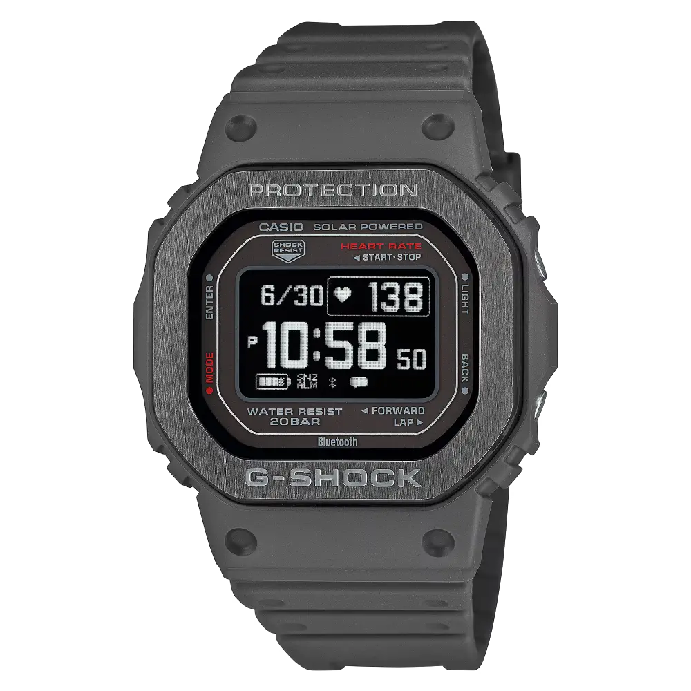Take control of your workouts and add flair to your everyday with the DW-H5600 from the tough, sports-oriented G-SQUAD line of G-SHOCK watches. These multi-sport watches come packed with functions for tracking all kinds of workouts. Measure your heart rate with the optical sensor and use the accelerometer to count steps. You can tap into the Polar™ smartwatch library to analyze workouts, track post-sleep recovery, and support breathing exercises — even use the oximeter to measure blood oxygen levels. Authentic fitness and health go along with caring about the environment, too. That’s why we’ve made the bezel and band from biomass plastics. Or opt for the luxe look of the DW-H5600MB, featuring a metal bezel finished in black ion plating and G-SHOCK colors with red accents against a gray base.