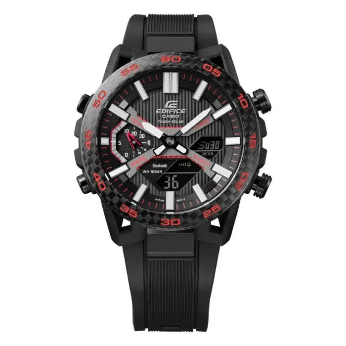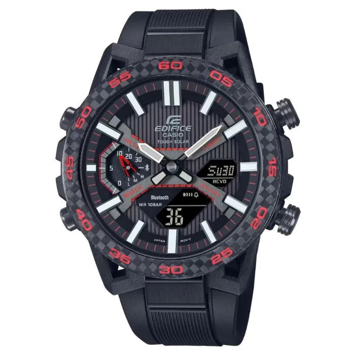 Experience speed and intelligence with the EDIFICE SMARTPHONE LINK MEN WATCH. The solar-powered analog-digital combination offers precise timekeeping, while its unique carbon fiber design, inspired by formula car suspension, adds a sporty touch. With Bluetooth? connectivity and a dedicated app, effortlessly manage world time and stopwatch data.