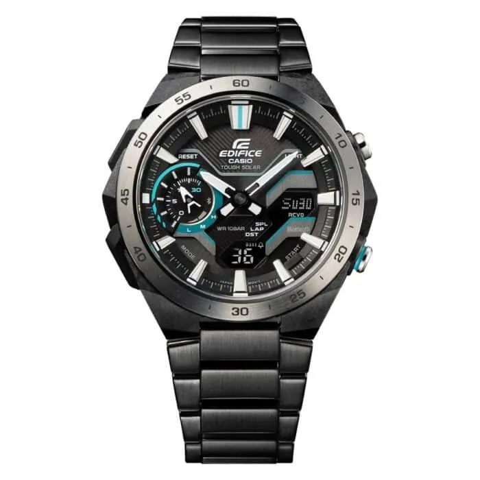 Discover the exhilarating speed of a formula race car with the Casio Edifice ECB-2200DD-1ADF Men's Watch Black. Equipped with a digital-analog chronograph and Bluetooth connectivity, this watch offers precise timekeeping and easy world time management. With a carbon fiber reinforced resin case and a sleek mechanical face, it's the perfect accessory for any racing enthusiast. Other features include world time for 31 time zones, a 1/100-second stopwatch, countdown timer, five daily alarms, and a full auto-calendar up to the year 2099. The hand shift feature adds to the convenience, allowing for an unobstructed view of the digital display.