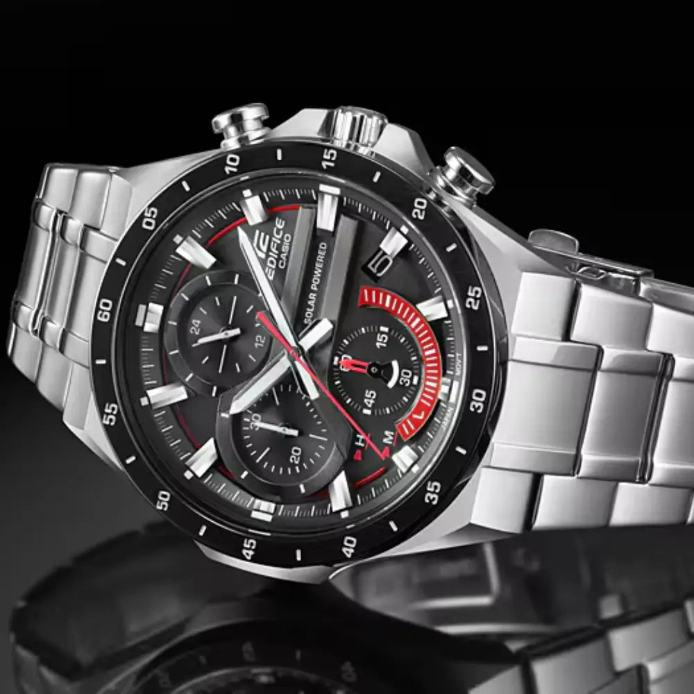 Solar Powered Chronograph | A solar-powered chronograph with a dynamic three-dimensional dial design. A full charge powers the watch for five months. The red lines accenting the dial create a sporty look. The Casio Edifice EQS-920DB-1AVUDF is a men's solar-powered chronograph watch that combines advanced functionality with a sleek design. Featuring a stainless steel case and band, the watch boasts a black dial accented with red lines, creating a sporty yet sophisticated appearance. The dynamic three-dimensional dial design enhances its visual appeal, making it suitable for both casual and formal settings.?