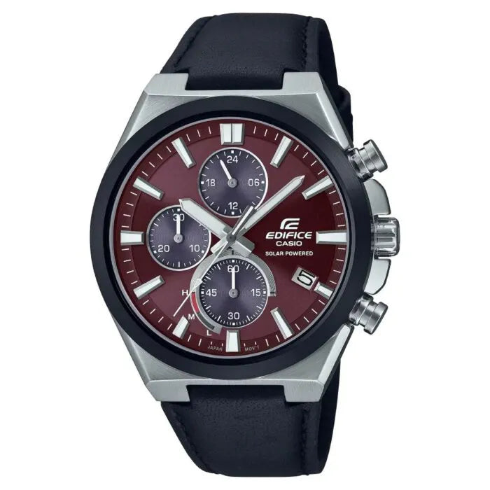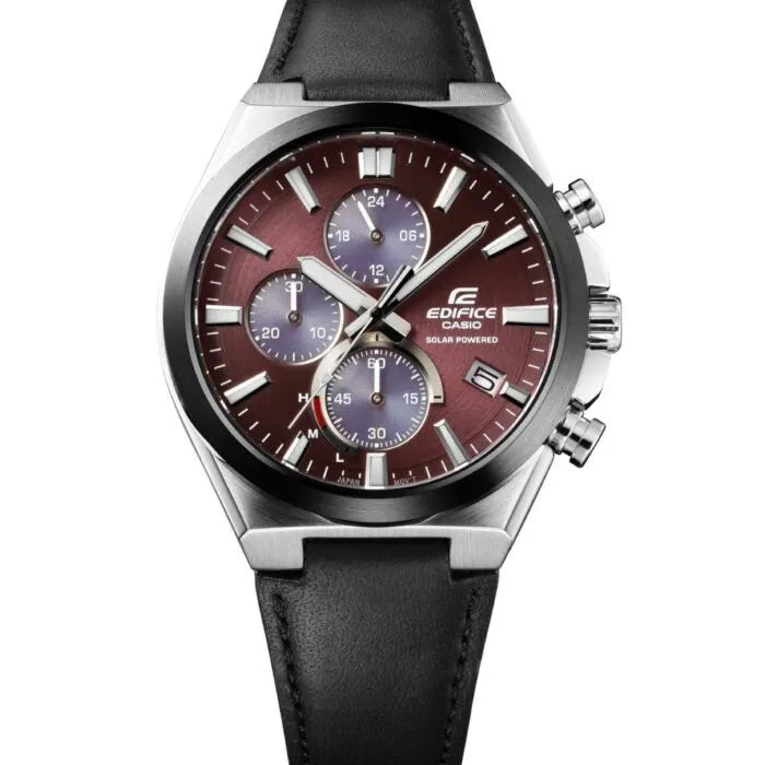 Experience simple sophistication with the EDIFICE Solar Powered Chronograph watch. Its solid lugs and bezel feature an ion-plated black finish for scratch-resistance. Powered by solar panels, it boasts three inset dials and a battery level indicator. The genuine leather band adds a stylish touch to this contemporary classic.