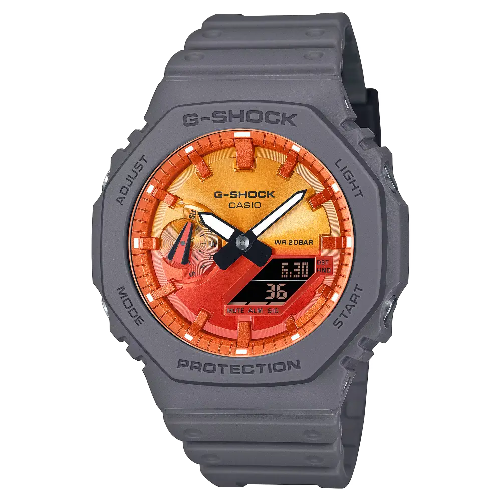 Fiery and bold G-SHOCK watches glowing with flames of awesome color. G-SHOCK is all about taking on challenges, and the vivid colorful gradation of the Flame Inside line puts this blazing passion front and center. Beginning with the GA-100 with distinctive large case and the GA-2100 with octagonal case, the design brings in motifs of billowing smoke for the band and features a brightly burning dial in flames of blues or oranges. Choose your favorite look — the GA-100FL-1A or GA-2100FL-1A with vivid blue dial and gradated gray-on-black body, representing the hottest flames of conviction against rising white plumes of smoke; or the GA-100FL-8A or GA-2100FL-8A with bold orange dial and gradated black-on-gray body, evoking flames of fiery passion against a dark smokey backdrop.
