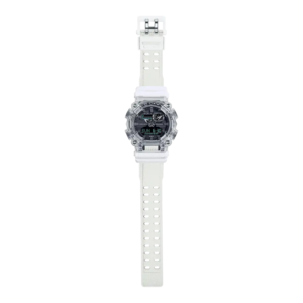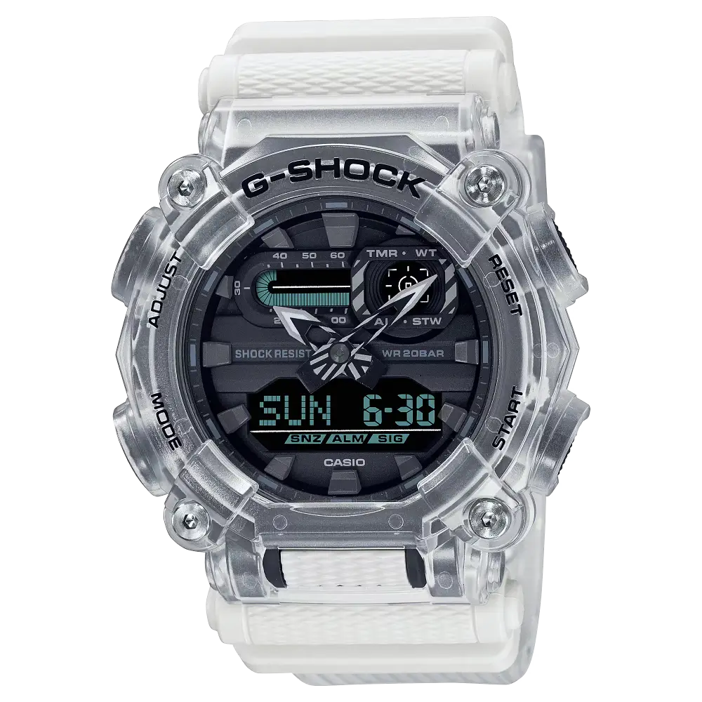 Inspired by a surge of sound flowing over a dance floor, these watches translate this vision into color and design for a stereophonic take on the rugged GA-900 with its sturdy oversized case featuring analog hands and digital display.
