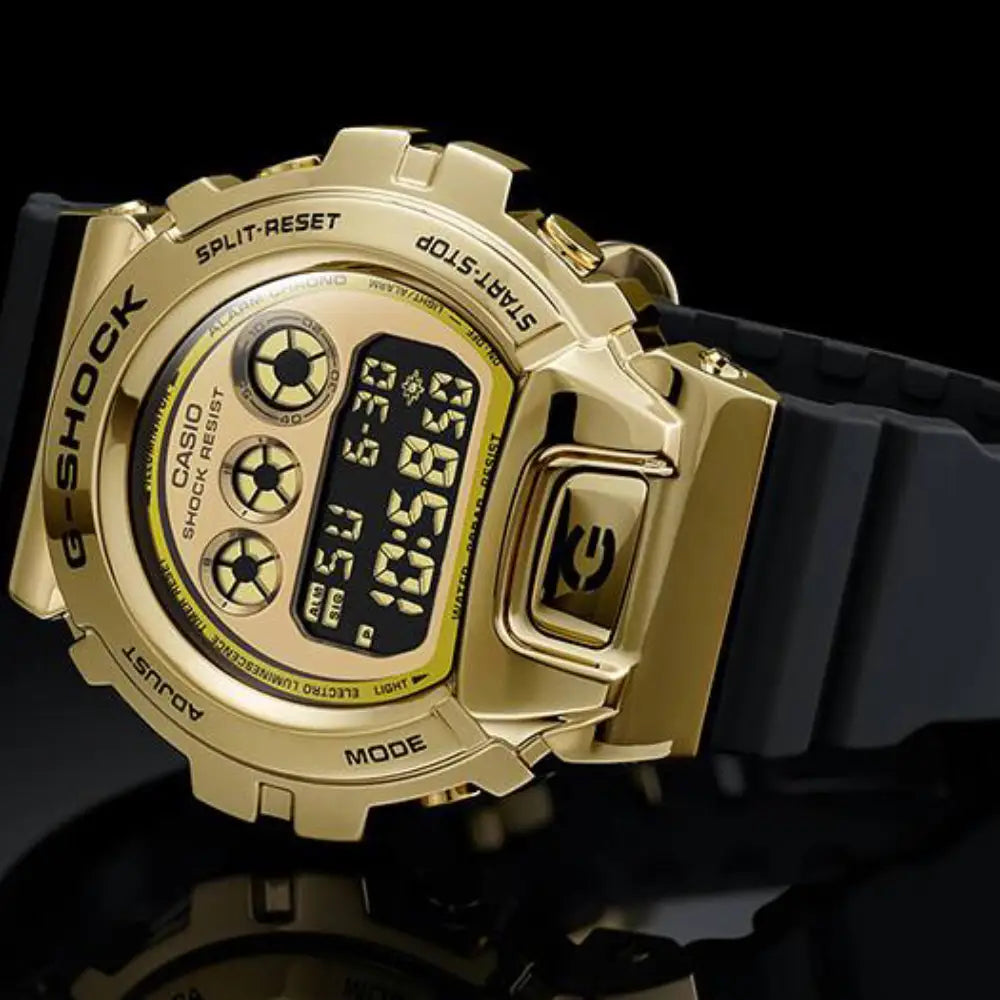This G-SHOCK model, GM-6900G-9PR, is similar to the GM-6900-1DR but features a gold-tone stainless steel metal bezel, offering a luxurious look suitable for both high-elegance and modern street fashion. It also commemorates the 25th anniversary of the DW-6900 release.