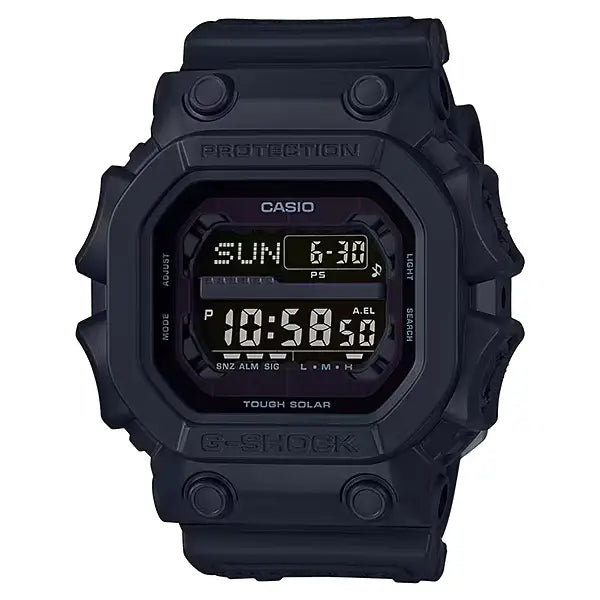 Introducing the G-SHOCK MEN WATCH GX-56BB-1DR, built for ultimate timekeeping toughness. The black one-tone resin design, based on the GX-56, can withstand impact from any direction. With a matte finish and black ion plated buckle, the watch's rugged form is the epitome of G-SHOCK's rough and tough image.