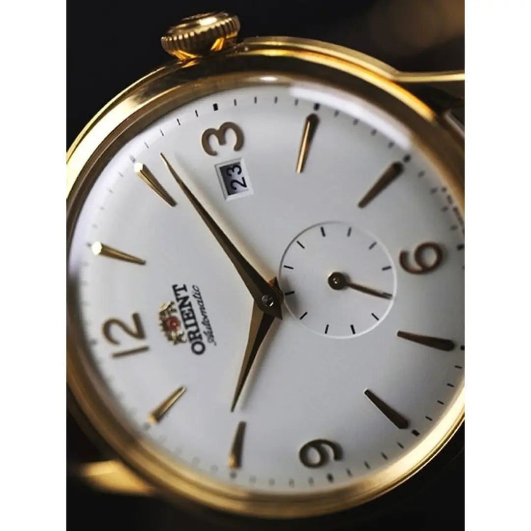 The Orient Bambino Small Seconds RA-AP0004S30B is a sophisticated men's automatic watch that combines vintage charm with modern functionality. Featuring a clean white dial with gold-tone Arabic numerals and indices, this timepiece is powered by Orient's in-house Caliber F6222 movement. Its small seconds sub-dial at the 6 o'clock position and domed mineral crystal add to its classic appeal, making it a perfect accessory for both formal occasions and everyday wear.