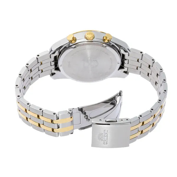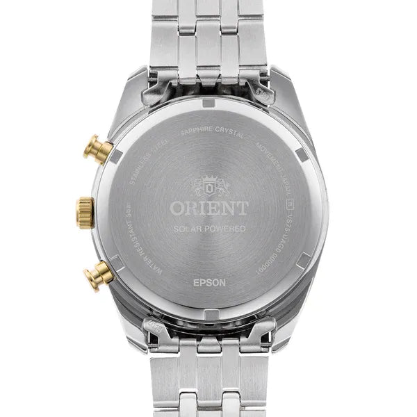 The Orient RA-TX0302S10B is a sophisticated men's solar-powered chronograph that seamlessly blends classic design with modern eco-conscious technology. Featuring a radiant white dial with gold-tone accents and a two-tone stainless steel case and bracelet, this timepiece exudes timeless elegance. Powered by Orient's in-house Caliber VS752 solar quartz movement, it offers a 6-month power reserve on a full charge, eliminating the need for regular battery replacements. With a 40mm case size and 50-meter water resistance, it's designed for both everyday wear and special occasions.