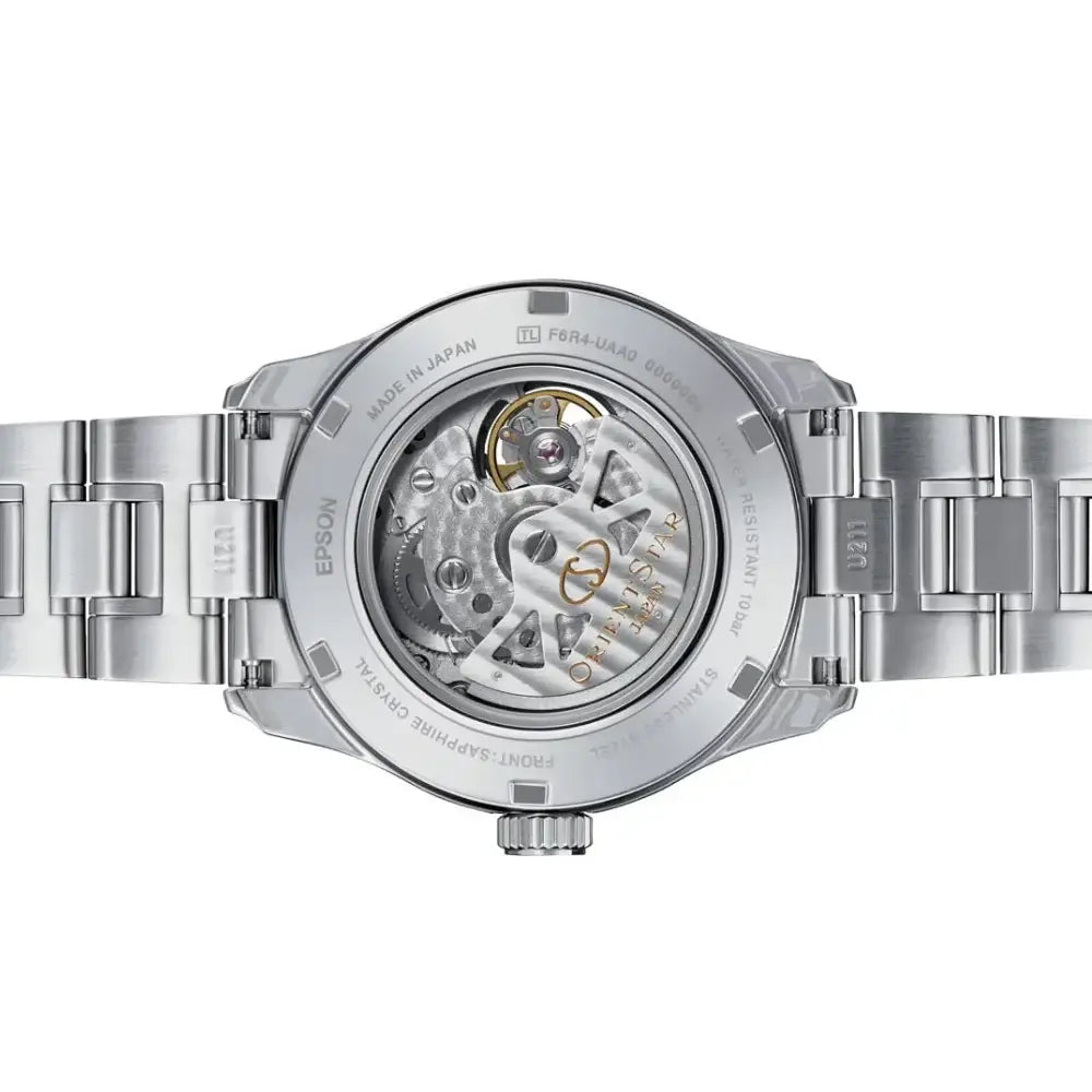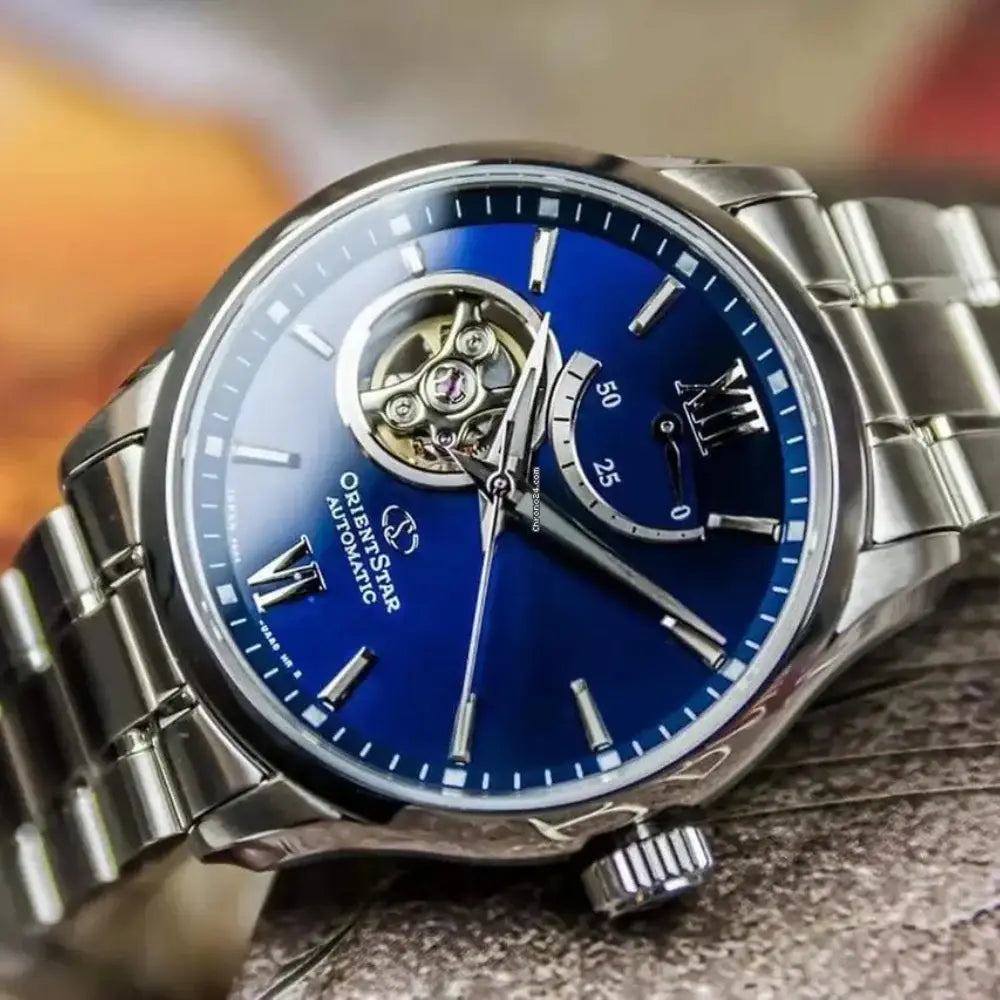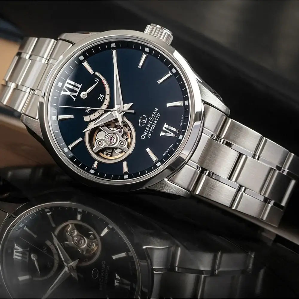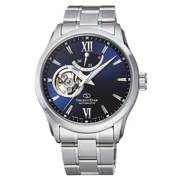 Experience a blend of classic elegance and technical excellence with the Orient Star Classic Automatic Power Reserve RE-AT0001 men's watch. This exquisite timepiece showcases a mesmerizing sunburst blue dial and a 39.3mm stainless steel case, offering a sophisticated presence on the wrist. At the heart of this watch is a reliable, in-house Orient automatic movement (Caliber F6R42), which is beautifully displayed through the open-heart design on the dial and a transparent case back. A functional power reserve indicator lets you know the remaining 50-hour runtime. The watch is protected by a scratch-resistant sapphire crystal with an anti-reflective coating and is complemented by a matching stainless steel bracelet. The Orient Star RE-AT0001 is a perfect choice for the discerning collector who appreciates meticulous craftsmanship and superior performance.