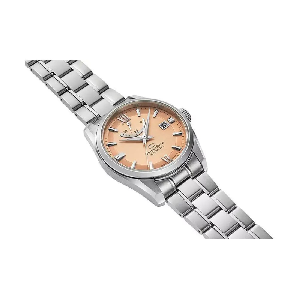 Experience rugged performance and sophisticated style with the Orient Star Sports Automatic Diver Power Reserve RE-AU0108G00B, a professional men's diving watch. This robust timepiece features a captivating copper dial with a sunburst effect, housed within a durable 43.6mm gold-toned stainless steel case. Powered by a reliable, in-house Orient automatic movement (Caliber F6N47), this watch is built for adventure. It includes a functional power reserve indicator that tracks the impressive 50-hour runtime and a convenient date display. The watch is protected by a scratch-resistant sapphire crystal with an anti-reflective coating and features a unidirectional rotating bezel and luminous hands and markers for superior visibility. Complemented by a matching gold-toned stainless steel bracelet and a water resistance of 200 meters, the Orient Star RE-AU0108G00B is the perfect choice for divers and watch enthusiasts alike.