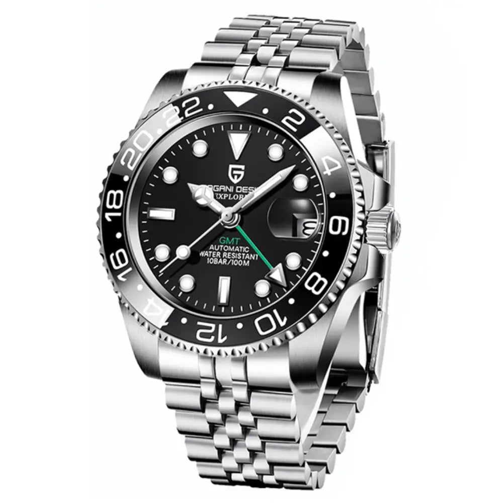 The Pagani Design PD1662 is a stylish and reliable automatic watch that brings a classic design with modern performance. Built with a solid stainless steel case, it features a striking black dial that’s protected by a synthetic sapphire crystal for extra durability. Powered by the dependable Pearl DG5833GMT automatic movement, this watch keeps time with precision and requires no batteries. With a 40mm case diameter and a 14mm thickness, it’s the perfect size for most wrists, offering a comfortable fit. The 220mm stainless steel band with a 20mm width adds a touch of sophistication, and the 48mm lug-to-lug distance ensures it sits just right. Weighing in at 148 grams, the PD1662 has a solid feel on the wrist that complements its robust design.