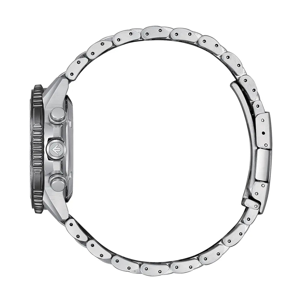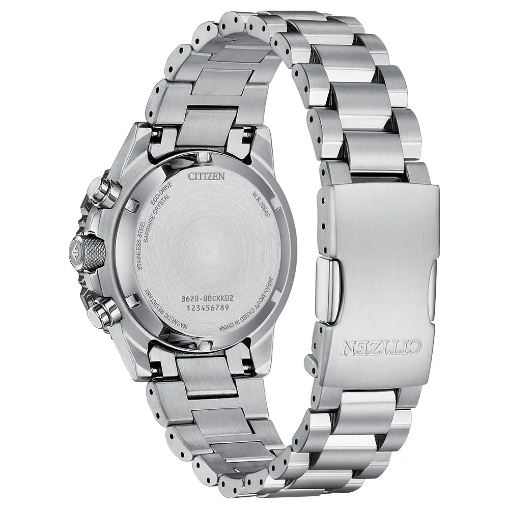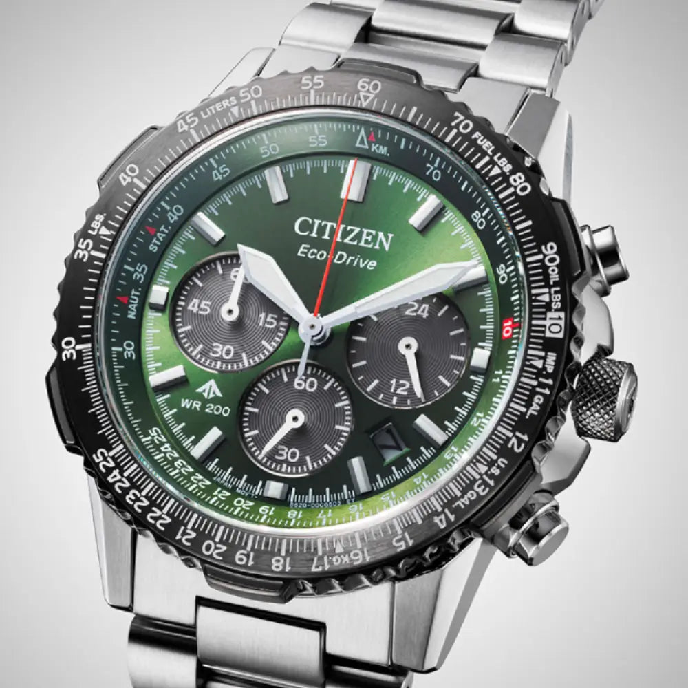 With advanced technology paired with an incredibly bold look, the latest Promaster Sky Chronograph reaches a higher altitude in style. The watch's silver-tone stainless steel case measures 40mm in diameter, wearing boldly with its sharp faceting and satin finishing, while a slide-rule scale on the bezel provides additional flight utility. A triple-link stainless steel bracelet secures the timepiece to the wrist. On the dial, a khaki green colorway with red, black, and white accents adds to the watch's superior legibility, while a sapphire crystal and 200m of water resistance protect it all. Functions include a 1/5 second chronograph measuring up to 60 minutes, 12/24 hour time displays, and a date indicator, all powered by our Eco-Drive technology – sustainably powered by light and never needing a battery. Caliber B620.