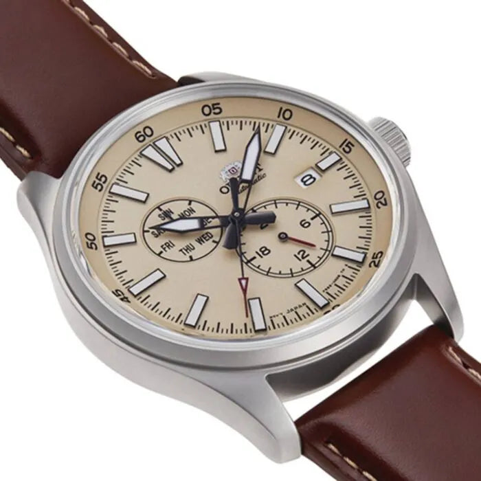 This adventurous ORIENT 42.4mm mechanical sports watch showcases a stainless steel case and band, dial, and screw-down crown to maximize water resistance. Distinguished features include a 24-hour sub-dial, weekday sub-dial, white hands and hour markers, and a convenient date aperture. The watch’s chapter ring is finished in a hash mark design for specific and easy time tracking. It supports water resistance of 100 meters.
