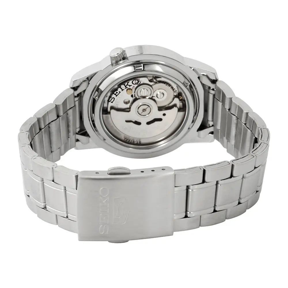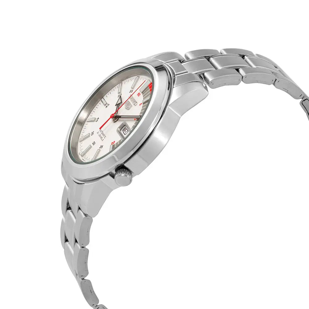 Experience classic style and reliable performance with the Seiko 5 Automatic 21 Jewels SNKK25K1 men's watch. This timeless timepiece features a crisp white dial with a sunburst effect, housed within a durable 38mm stainless steel case. Powered by a dependable in-house automatic movement (Caliber 7S26) with 21 jewels that requires no battery, this watch includes a convenient day and date display. The transparent case back offers a glimpse into the intricate mechanics of the watch. With its luminous hands and markers, a scratch-resistant Hardlex crystal, and a water resistance of 30 meters, the Seiko SNKK25K1 is a perfect choice for those who appreciate both classic design and dependable functionality.