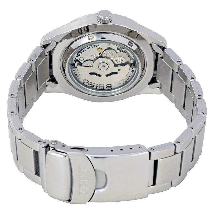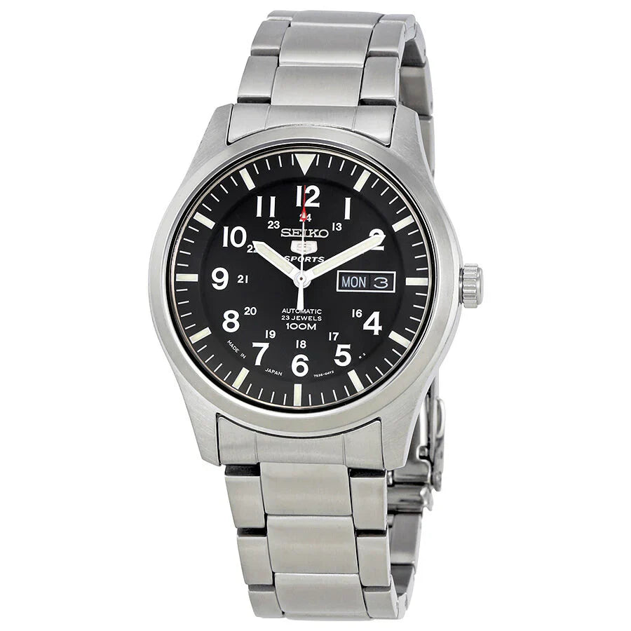 The Seiko SNZG13K1 is a robust timepiece from the esteemed Seiko 5 Sports series, blending military-inspired design with reliable functionality. Its 42 mm stainless steel case encases a matte black dial featuring luminous hands and Arabic numeral markers, ensuring readability in various lighting conditions. Powered by the dependable Seiko Caliber 7S36 automatic movement, it offers precise timekeeping along with day and date displays positioned at 3 o'clock. The exhibition case back provides a glimpse into the watch's intricate mechanics. With a water resistance of up to 100 meters, it's suitable for everyday wear and recreational water activities.