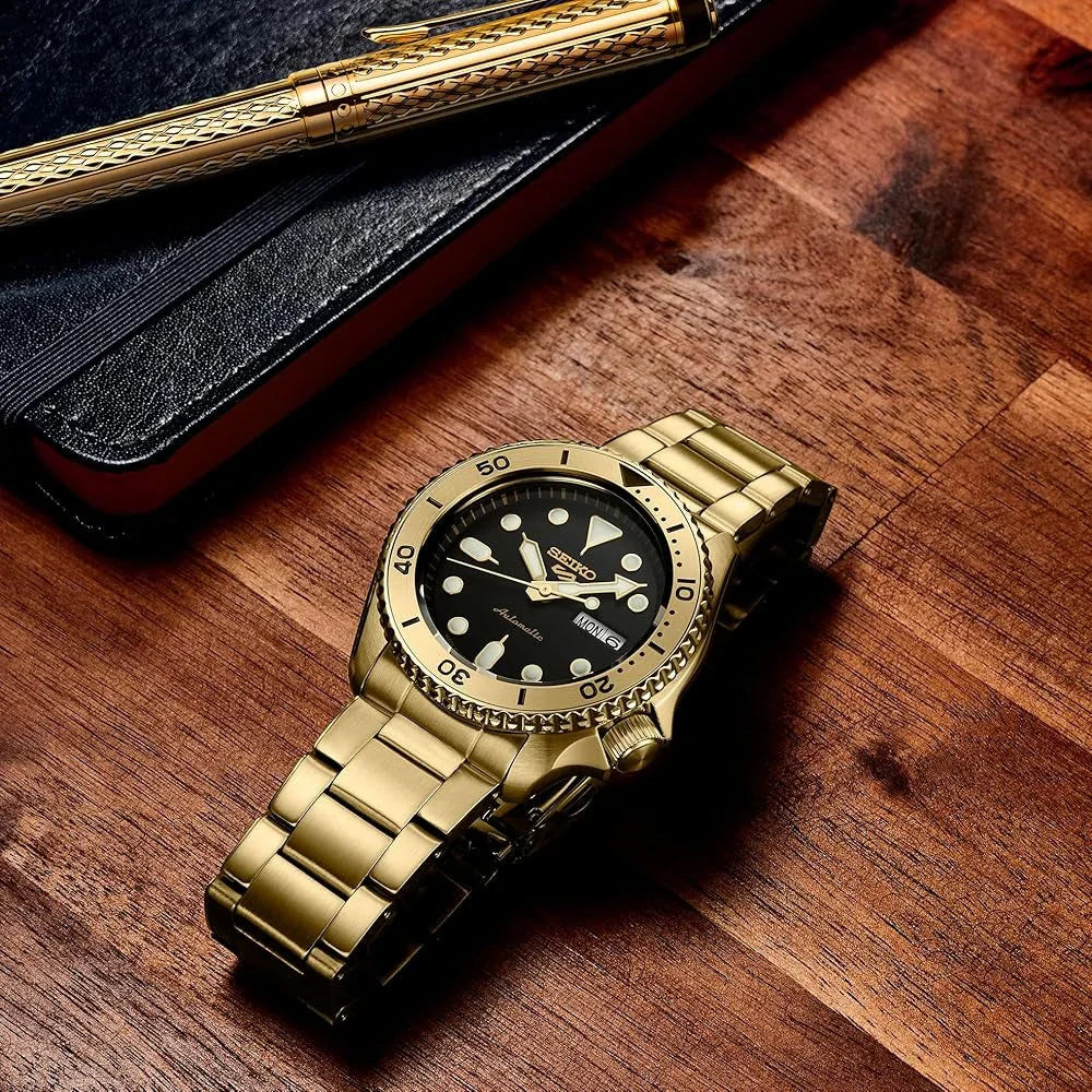Make a bold statement with the Seiko 5 Sports SRPK18, a dynamic men's automatic watch that blends classic sport-dress styling with a luxurious edge. This model features a striking gold-tone stainless steel case and matching bracelet, perfectly complementing its sharp black dial with luminous hands and markers for excellent readability. Powered by Seiko's reliable 4R36 automatic movement with 24 jewels, it offers a 41-hour power reserve and includes a convenient day/date display. With its 100m water resistance, rotating bezel, and Hardlex crystal, the SRPK18 delivers both durability and distinctive style, making it an ideal choice for the discerning wearer who appreciates a touch of opulence in a versatile everyday timepiece.