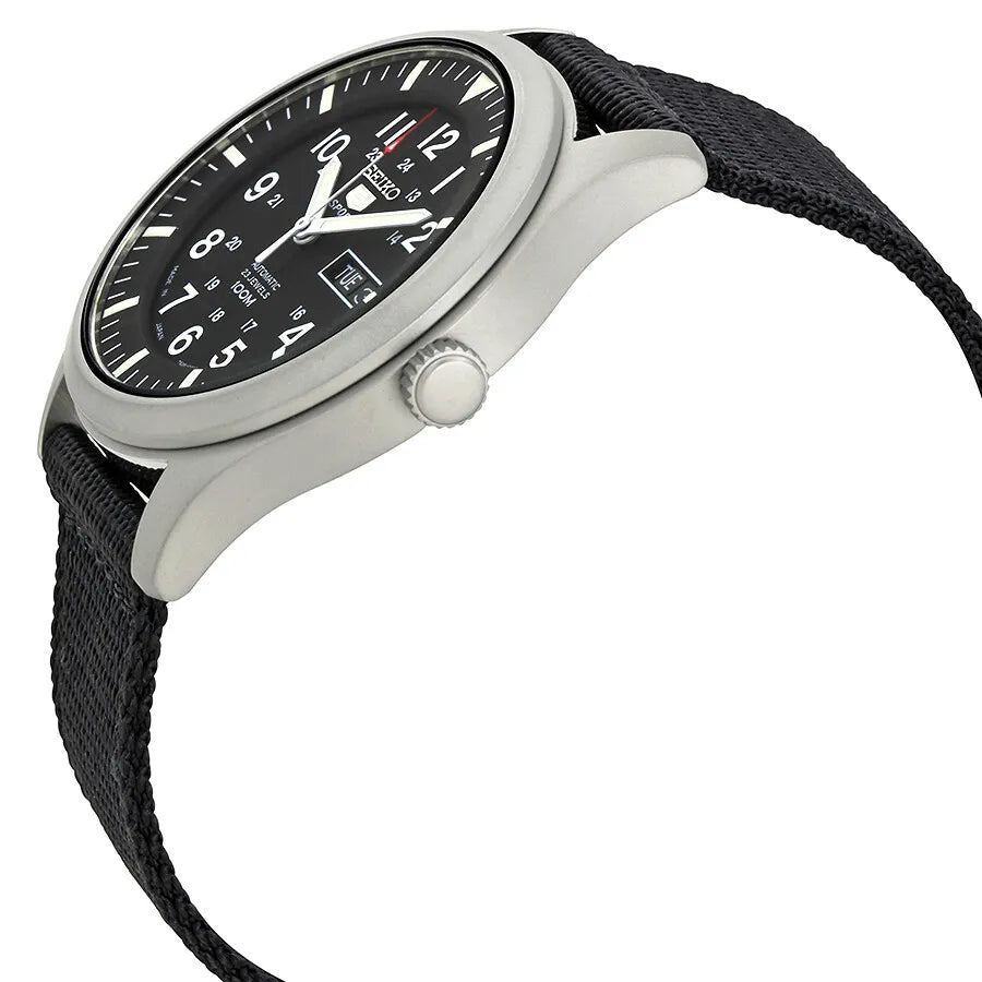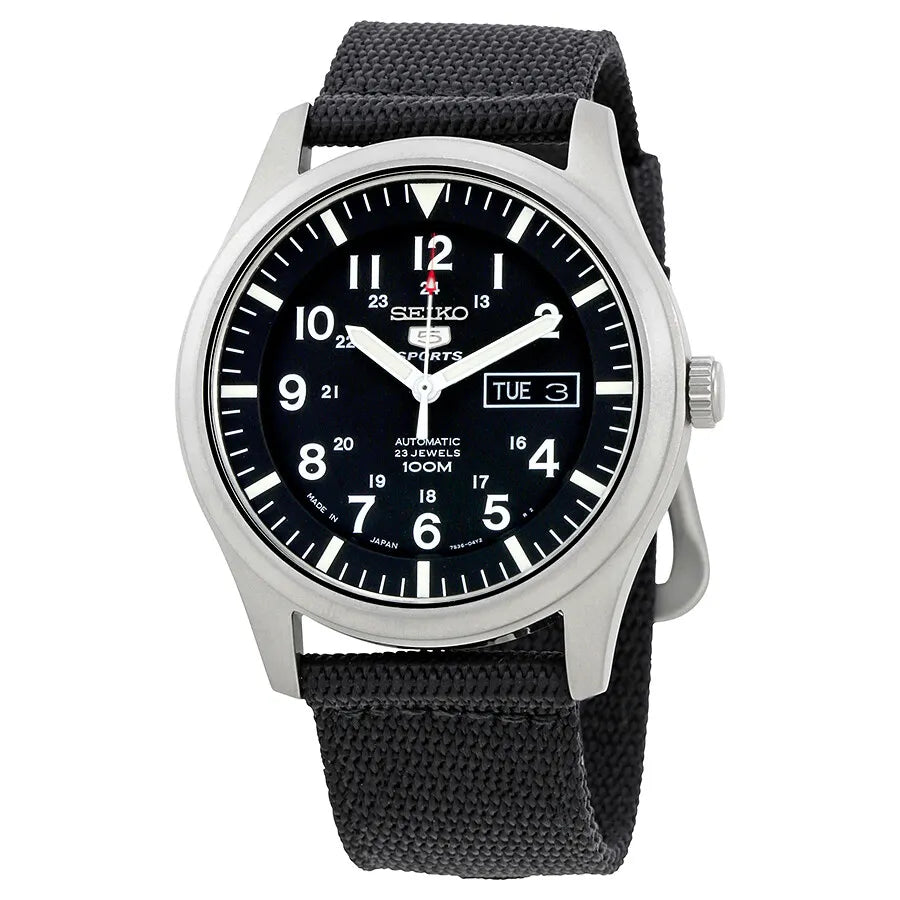 Embrace rugged durability and classic military-inspired design with the Seiko 5 Sports Automatic Field Watch SNZG15J1. This timepiece, built with legendary "Made in Japan" craftsmanship, features a clean and highly legible black dial with luminous hands and markers, all housed within a robust 42mm stainless steel case. Powered by a reliable, in-house Seiko automatic movement (Caliber 7S26), this watch requires no battery and features a convenient day and date display. The movement is visible through a transparent case back. The watch is protected by a durable Hardlex crystal and is completed by a comfortable black nylon strap. With a water resistance of 100 meters, the Seiko SNZG15J1 is a dependable and stylish companion for any adventure.