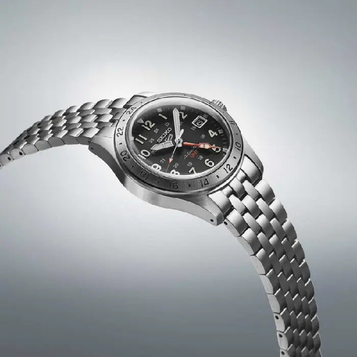 Designed for global explorers, the Seiko 5 Sports Automatic GMT SSK023K1 is a versatile and robust men's watch. This timepiece features a sleek black dial with a 24-hour ring for tracking a second time zone, all housed within a durable 39.4mm stainless steel case. At the heart of this watch is a reliable, in-house automatic GMT movement (Seiko Caliber 4R34) with a date display. The watch is protected by a durable Hardlex crystal and showcases the movement through a transparent case back. With its highly luminous hands and markers and a robust stainless steel bracelet, the Seiko SSK023K1 is a dependable and stylish companion for any journey, boasting a water resistance of 100 meters.