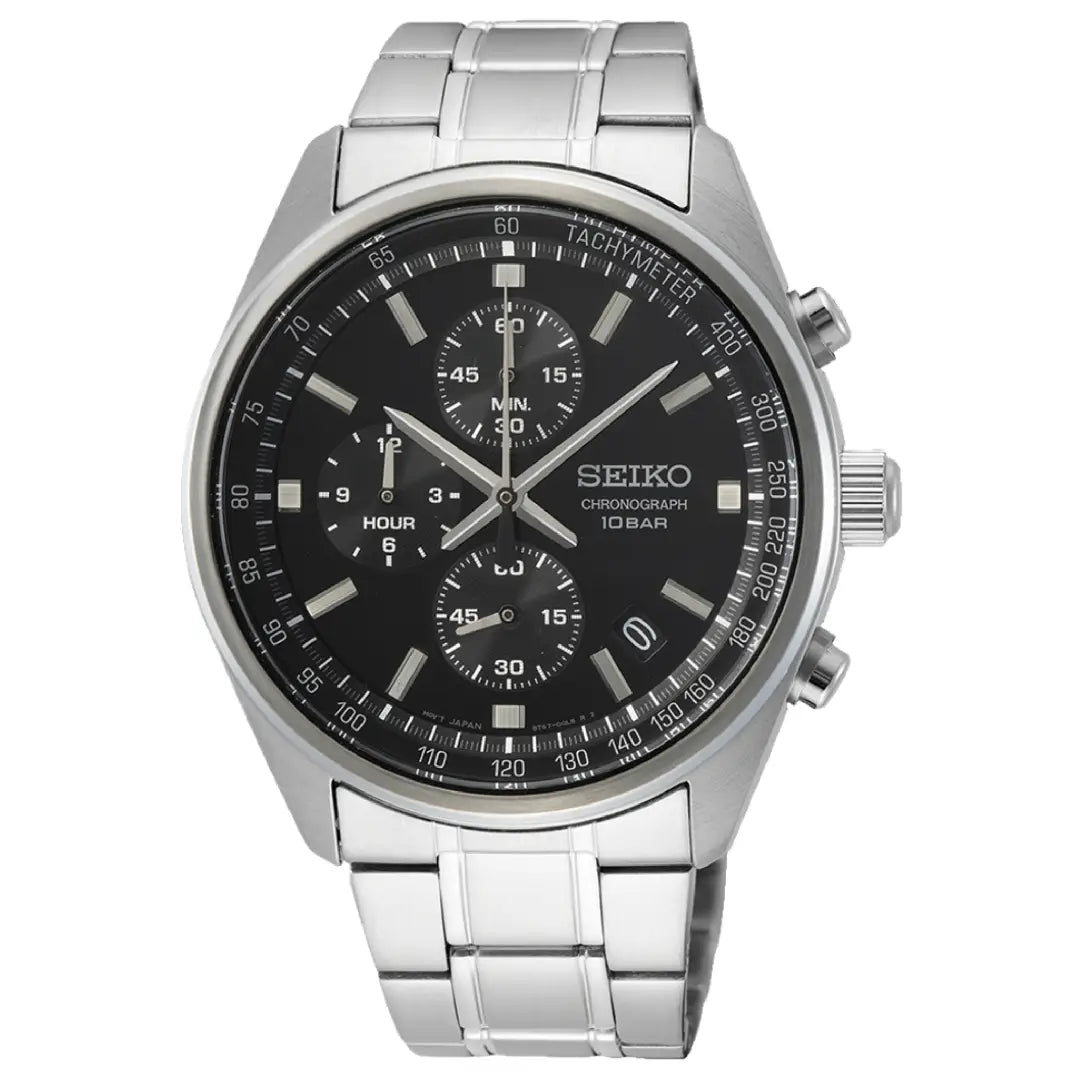 Built for precision and speed, the Seiko Chronograph Quartz SSB379 is a high-performance men's watch designed with a sporty aesthetic. This bold timepiece features a sleek black dial with three sub-dials for chronograph functionality, all housed within a robust 43.9mm black ion-plated stainless steel case. Powered by a precise quartz chronograph movement, this watch provides accurate timekeeping and is equipped with a 60-minute stopwatch and a 24-hour sub-dial. The watch is protected by a durable Hardlex crystal and features highly luminous hands and markers for superior readability. A matching black ion-plated stainless steel bracelet and a water resistance of 100 meters make the Seiko SSB379 a dependable and stylish accessory for any occasion.