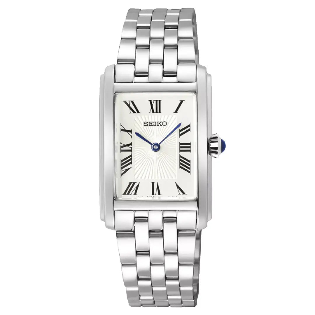 Seiko Essentials SWR083P1 (Seiko Tank) Classic Rectangular White Dial with Blue Hands Stainless Steel Women&