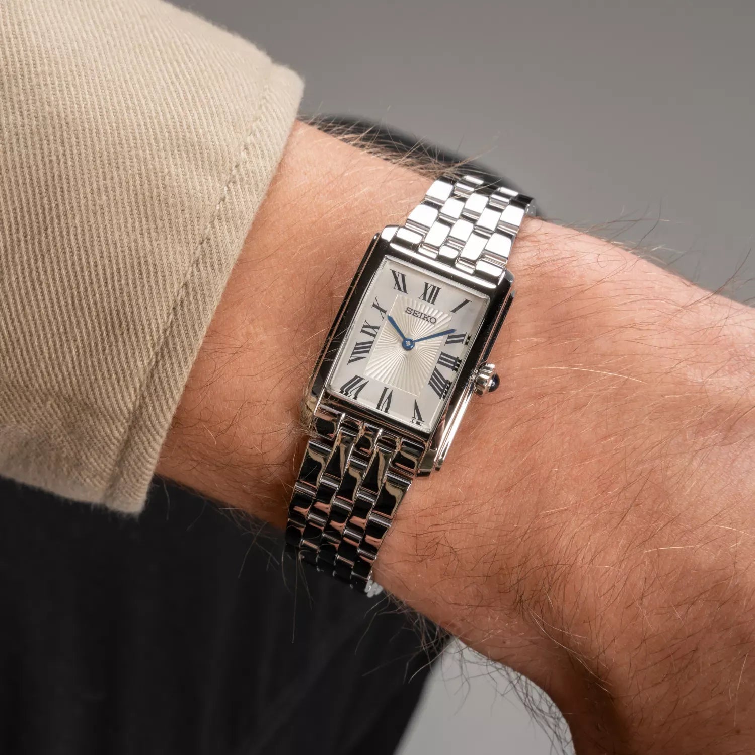 Seiko Essentials SWR083P1 (Seiko Tank) Classic Rectangular White Dial with Blue Hands Stainless Steel Women's Watch