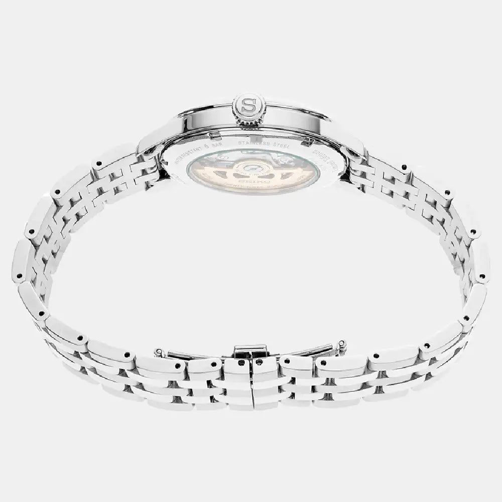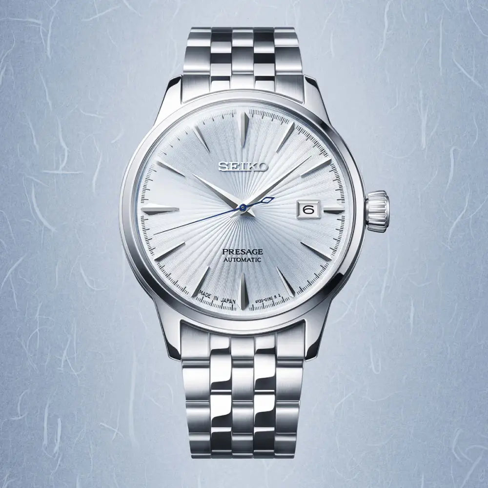 Experience the elegant artistry of Japanese watchmaking with the Seiko Presage Cocktail Time Automatic SRPE19J1. This timepiece, crafted in Japan, features a mesmerizing light blue dial with a pressed sunburst pattern that beautifully captures the essence of a "Skydiving" cocktail.The watch is housed in a polished stainless steel case with a diameter of 40.5mm, offering a refined presence on the wrist. At the heart of this timepiece is a reliable, in-house automatic movement (Seiko Caliber 4R35) with a 41-hour power reserve and a date function.The watch is protected by a vintage-inspired box-shaped Hardlex crystal and showcases the movement through a transparent case back.A polished stainless steel bracelet with a three-fold clasp provides a comfortable and secure fit. The Seiko SRPE19J1 is a perfect choice for those who appreciate meticulous craftsmanship and a timeless, sophisticated aesthetic.