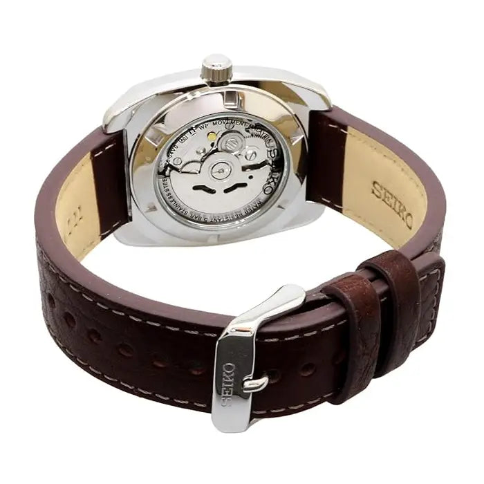 Experience a blend of retro-inspired style and modern performance with the Seiko Recraft Automatic SNKP27 men's watch. This timepiece features a distinctive green dial with a sunburst effect and a comfortable cushion-shaped 39.5mm stainless steel case. Powered by a reliable, in-house automatic movement (Seiko Caliber 7S26), this watch requires no battery and includes a convenient day and date display. The movement is visible through a transparent case back. The watch is protected by a scratch-resistant Hardlex crystal and is complemented by a high-quality brown genuine leather strap. With a water resistance of 50 meters, the Seiko SNKP27 is a perfect choice for those who appreciate both a unique aesthetic and dependable functionality.