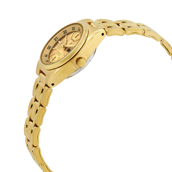 The Seiko SYMC04J1 features a radiant gold-toned dial, complemented by gold-tone hands and index markers that offer a seamless, luxurious appeal. Its polished stainless steel case and matching bracelet, both finished in gold plating, deliver a bold yet sophisticated statement on the wrist. The compact 25mm case is perfectly sized for a graceful, comfortable fit, while the fold-over clasp with a push-button release ensures security and ease of wear.