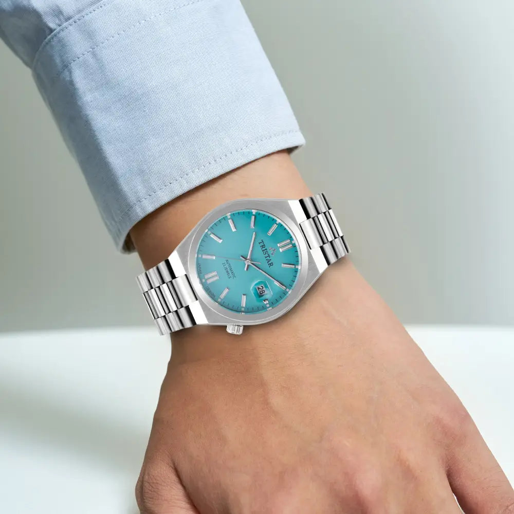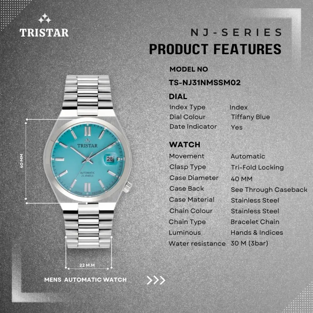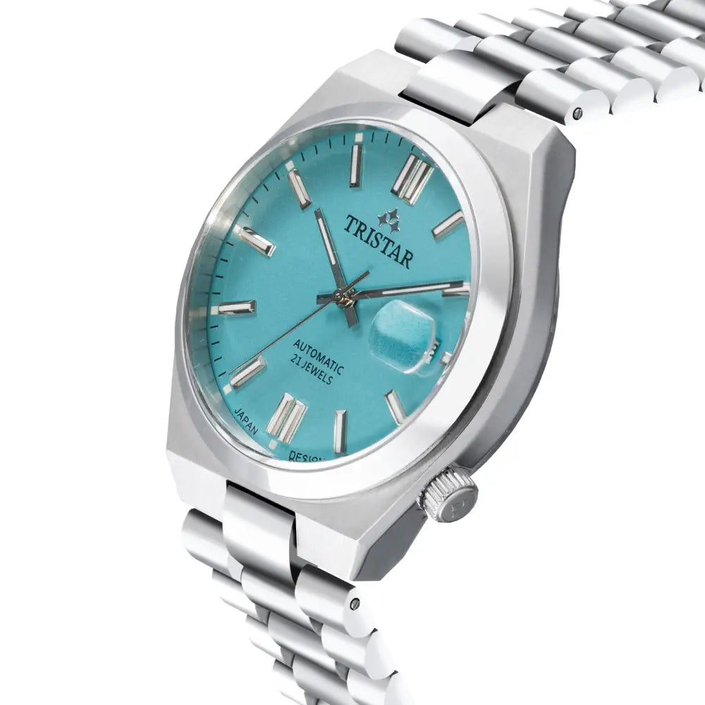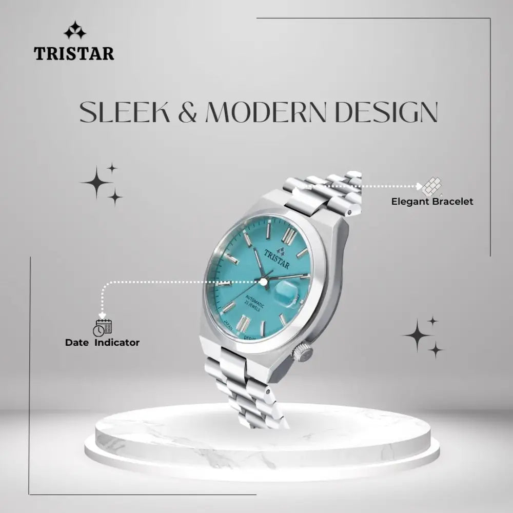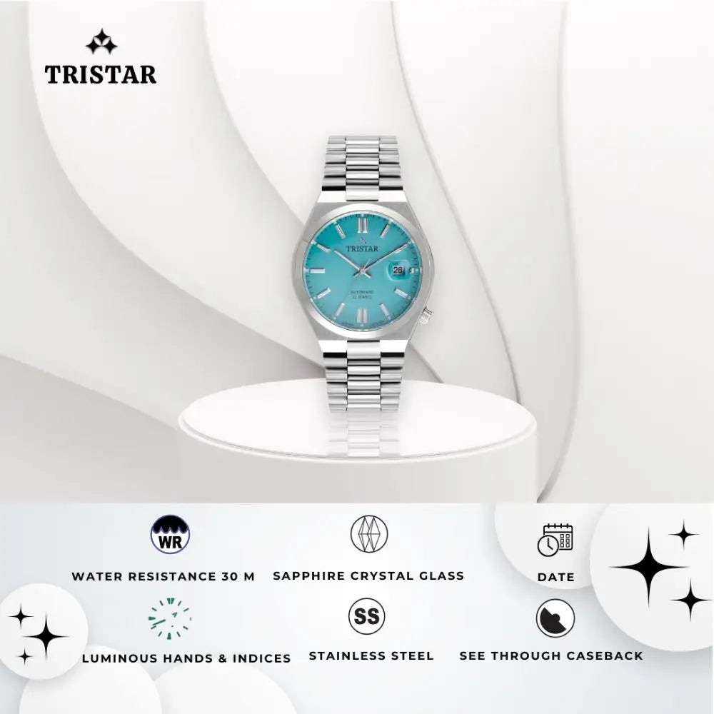 The Tristar Basic Index Turqoise Dial Stainless Steel Men’s Watch combines timeless appeal with modern precision, offering a sophisticated accessory that suits any lifestyle. With a 40mm case and a mechanical self-winding movement, this men’s automatic watch ensures effortless and reliable timekeeping day after day. Its sleek black dial is complemented by a distinctive stainless steel bracelet, adding both durability and refined style to your wrist. Designed to go beyond the ordinary, Tristar pairs this watch with scratch-resistant sapphire crystal glass, ensuring lasting luxury and resilience. This timepiece is a perfect expression of classic design elevated by contemporary craftsmanship.
