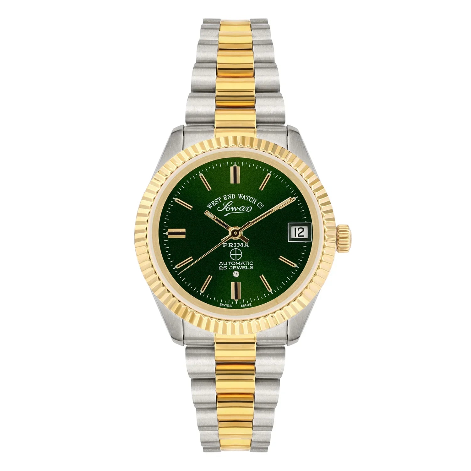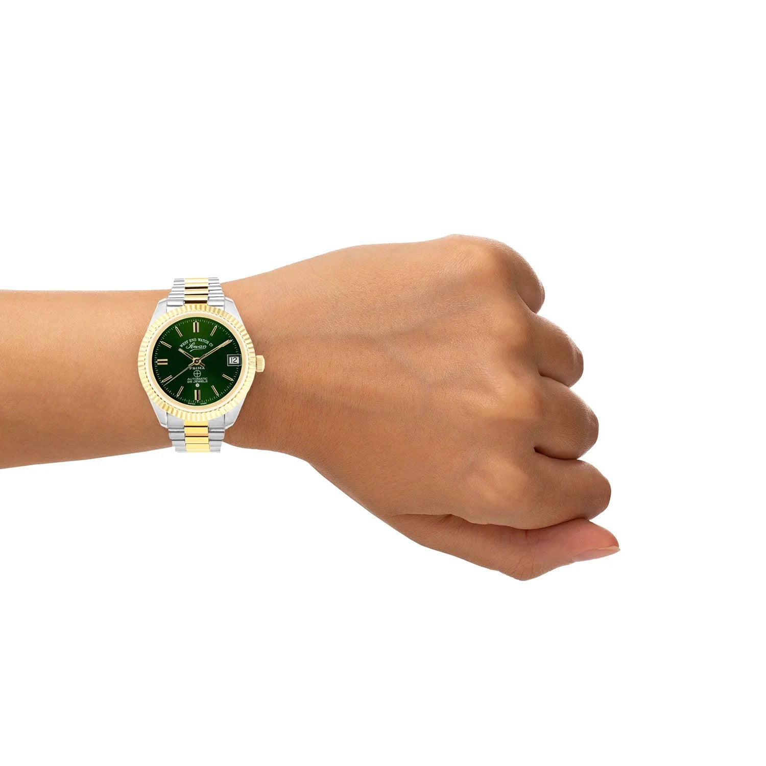 Discover the exquisite West End Watch Co. The Classics 6858.20.3330Y, a sophisticated women's automatic watch that radiates timeless elegance. This 32mm timepiece features a mesmerizing green sunray dial, beautifully complemented by polished gold indices and a practical date display. Encased in durable stainless steel and paired with a luxurious two-tone silver and gold stainless steel bracelet, it offers a refined and versatile aesthetic. Powered by a precise Swiss automatic movement, this West End automatic watch ensures accurate timekeeping with classic appeal. Its slim profile and durable construction make the 6858.20.3330Y an ideal accessory for the modern woman who values both style and Swiss craftsmanship.