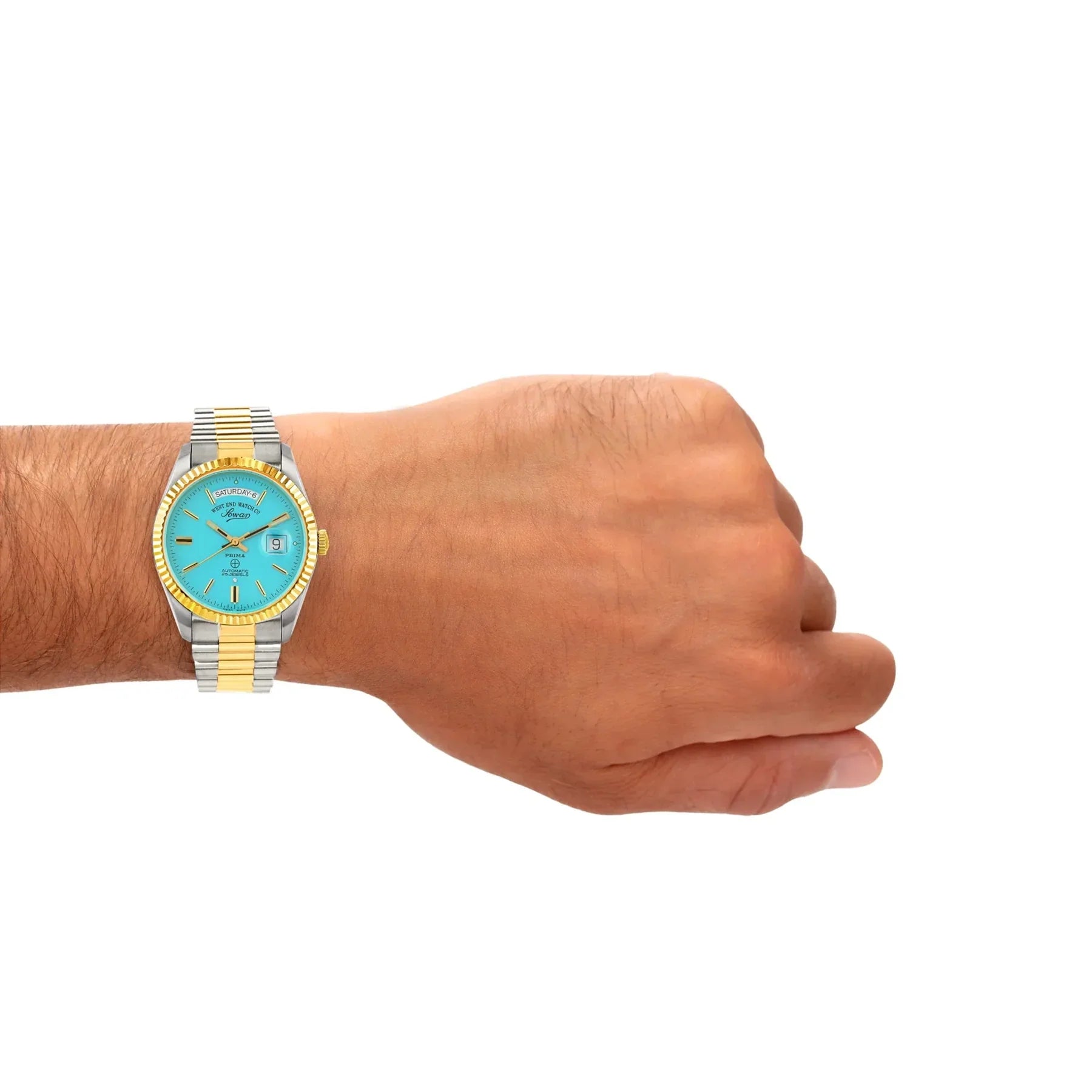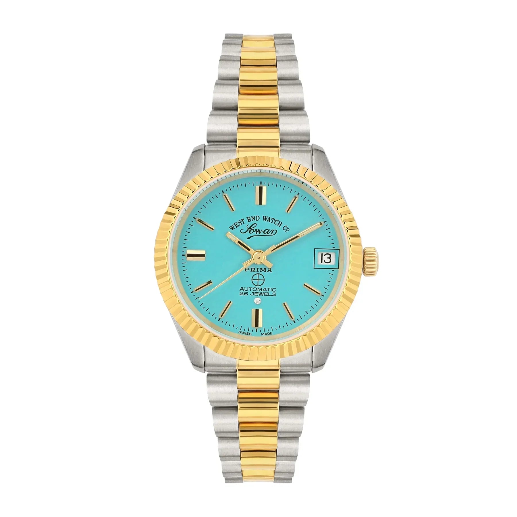 Discover the vibrant elegance of the West End Watch Co. The Classics 6858.20.3337Y, a sophisticated women's automatic watch. This 32mm timepiece features a striking turquoise dial that captures attention, perfectly complemented by a luxurious two-tone silver and gold stainless steel bracelet. Powered by a reliable Swiss automatic movement, it offers precise timekeeping and a practical date display. Designed for versatility and lasting style, this West End automatic watch blends classic craftsmanship with a contemporary pop of color. The 6858.20.3337Y is an ideal accessory for the modern woman who values both Swiss quality and a distinctive aesthetic.
